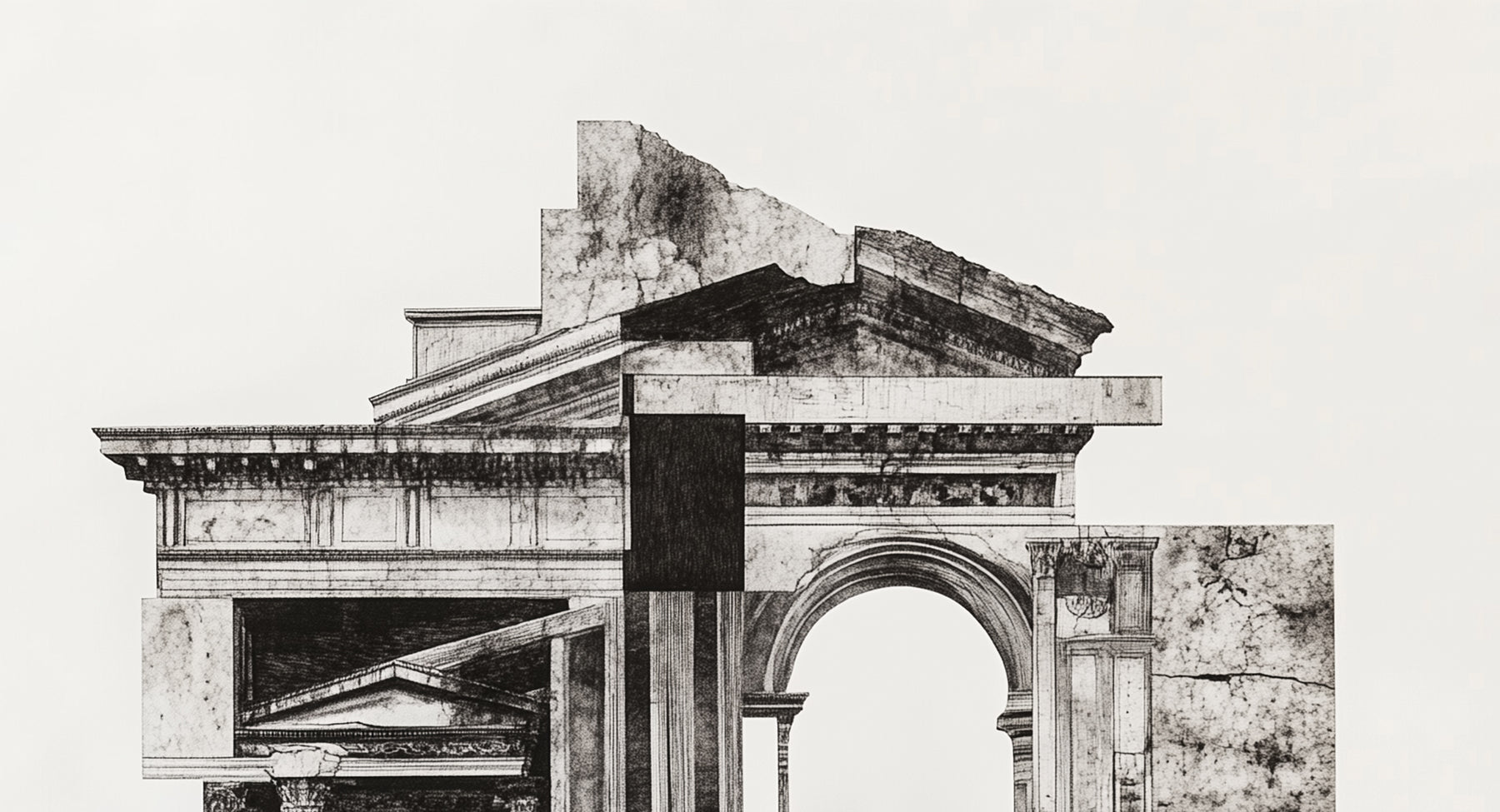 Collages that explore the ephemeral nature of memory and civilisation - merging history with imagination in timeless, impossible structures.