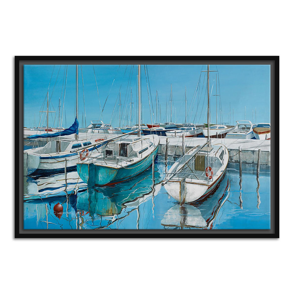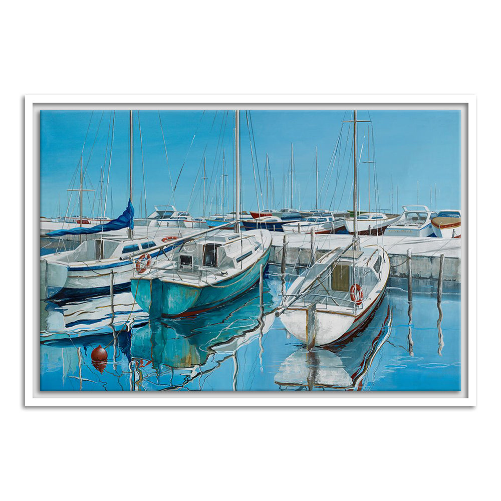 The canvas is wrapped and stretched similar to a gallery wrap and then mounted inside a wooden frame, leaving a small "gap", to create the illusion that the canvas is floating within the frame.