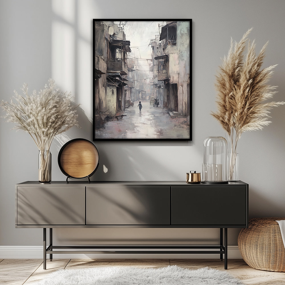 A high quality PVC frame with an off-white mount. Thickness of mount ranges from 1 - 4 inches depending on size of the artwork. The artwork is protected by a layer of clear glass or acrylic. Price: $$