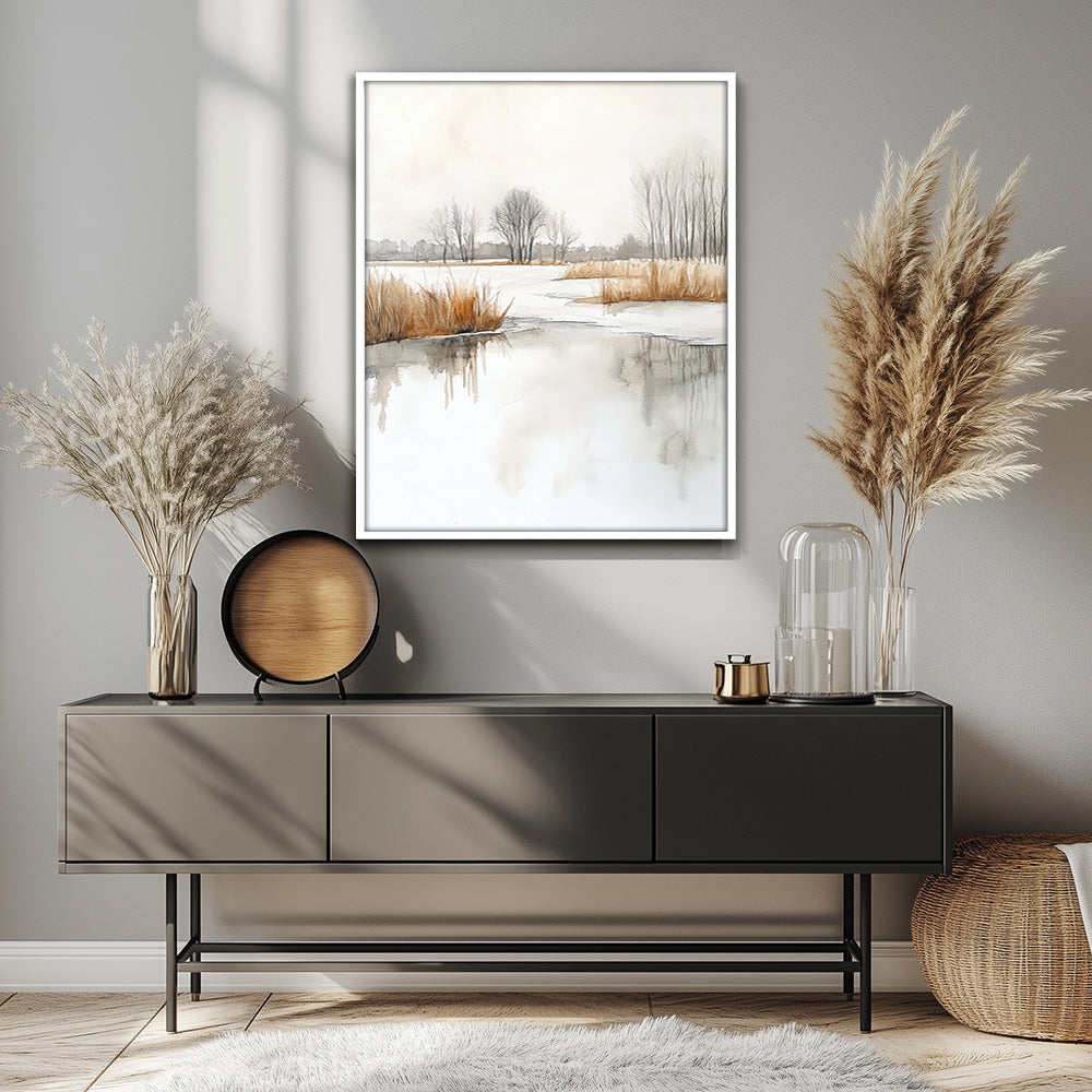 A high quality PVC frame with a front thickness of 0.5 inch and a depth of 1 inch. The artwork is protected by a layer of clear glass or acrylic. Price: $