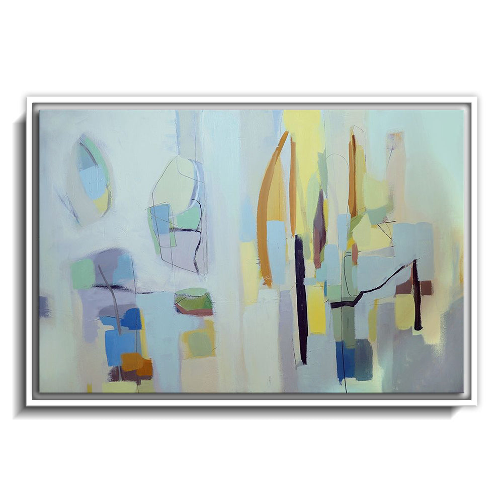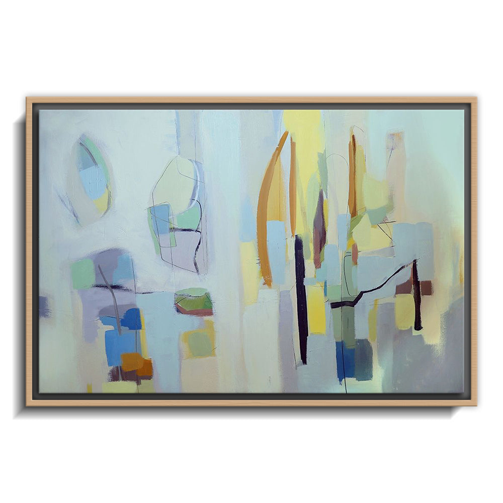 The canvas is wrapped and stretched similar to a gallery wrap and then mounted inside a wooden frame, leaving a small "gap", to create the illusion that the canvas is floating within the frame.
