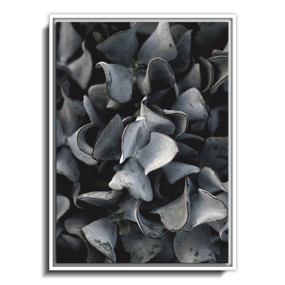 The canvas is wrapped and stretched similar to a gallery wrap and then mounted inside a wooden frame, leaving a small "gap", to create the illusion that the canvas is floating within the frame.