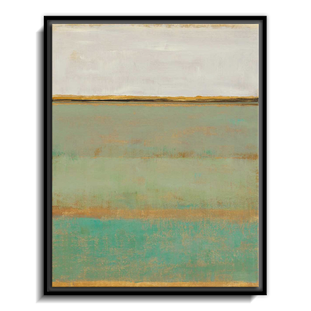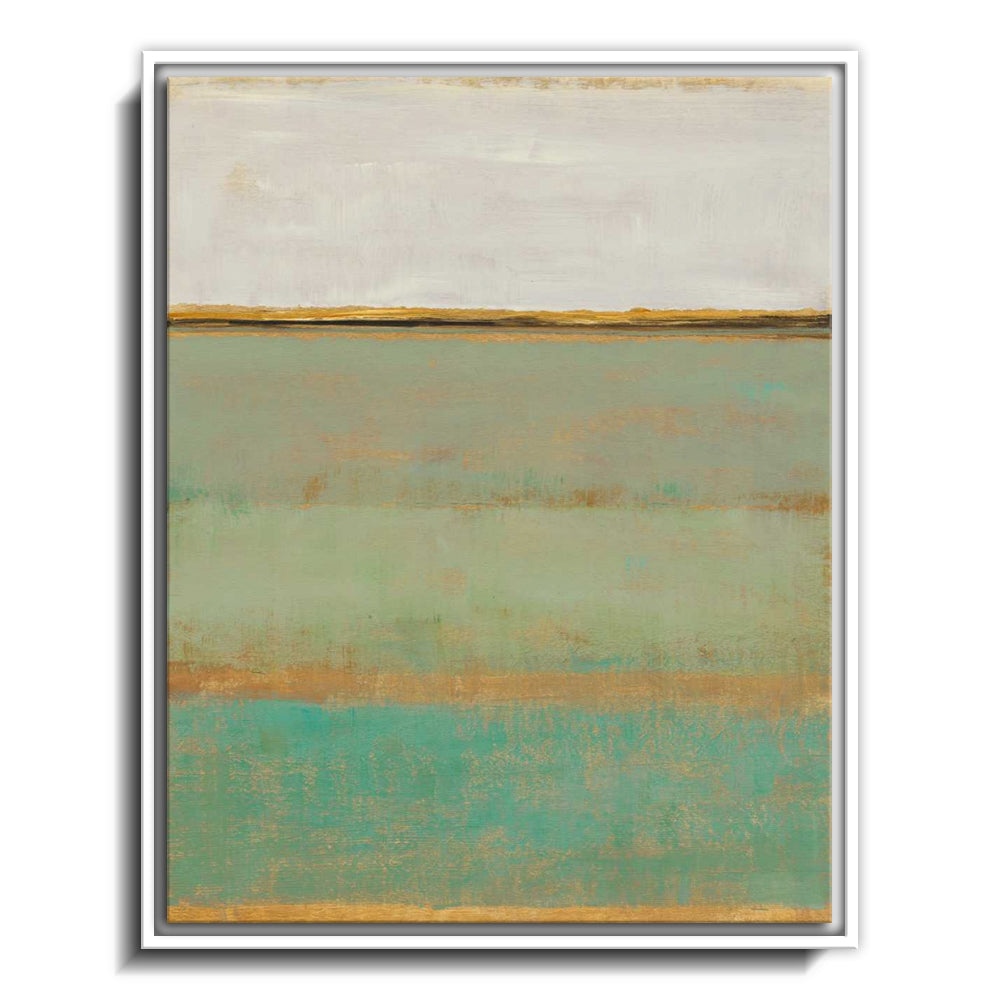 The canvas is wrapped and stretched similar to a gallery wrap and then mounted inside a wooden frame, leaving a small "gap", to create the illusion that the canvas is floating within the frame.