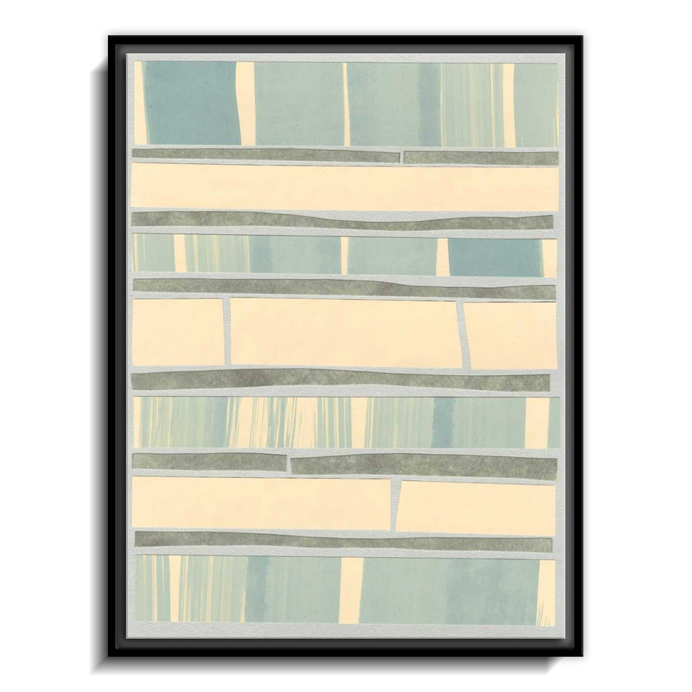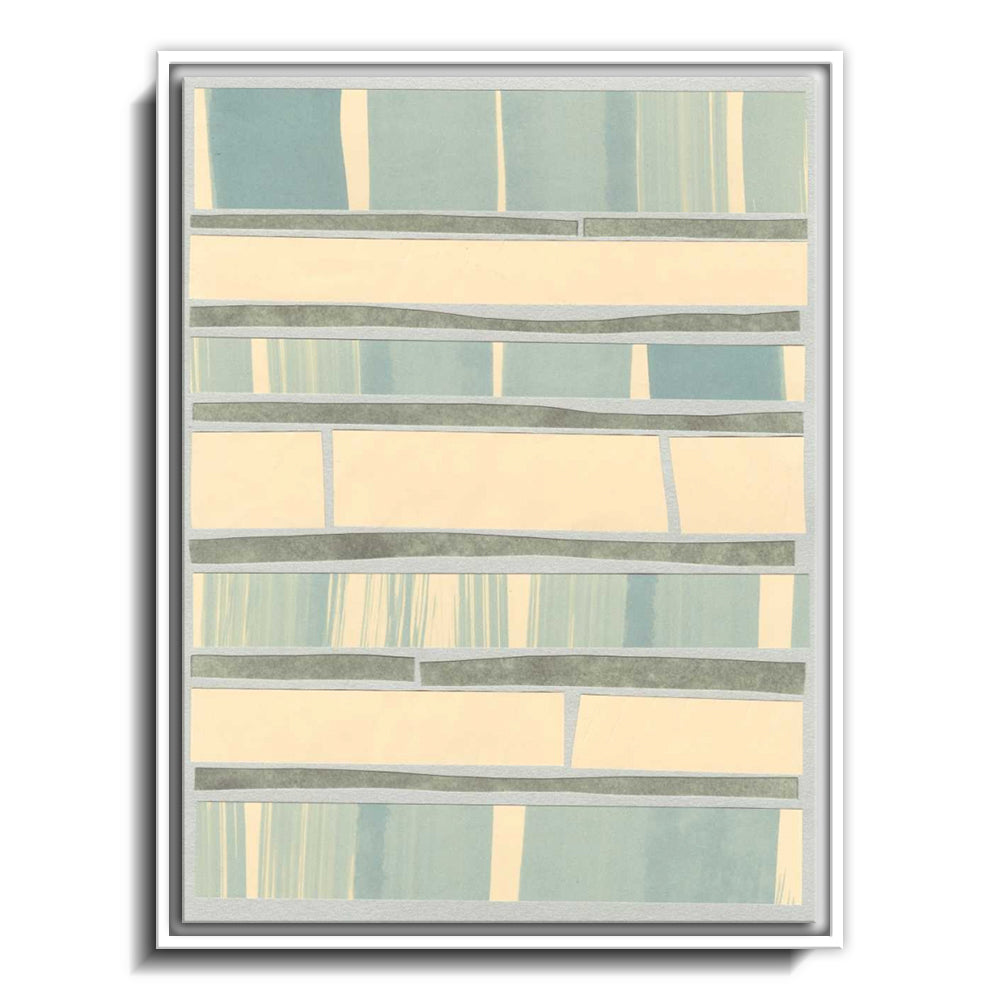 The canvas is wrapped and stretched similar to a gallery wrap and then mounted inside a wooden frame, leaving a small "gap", to create the illusion that the canvas is floating within the frame.