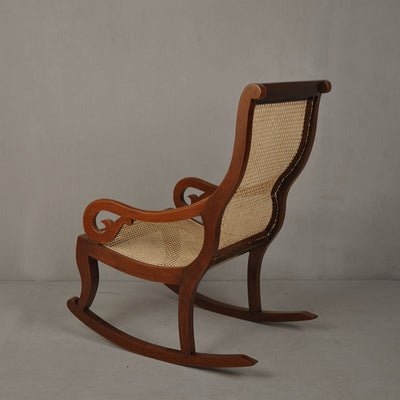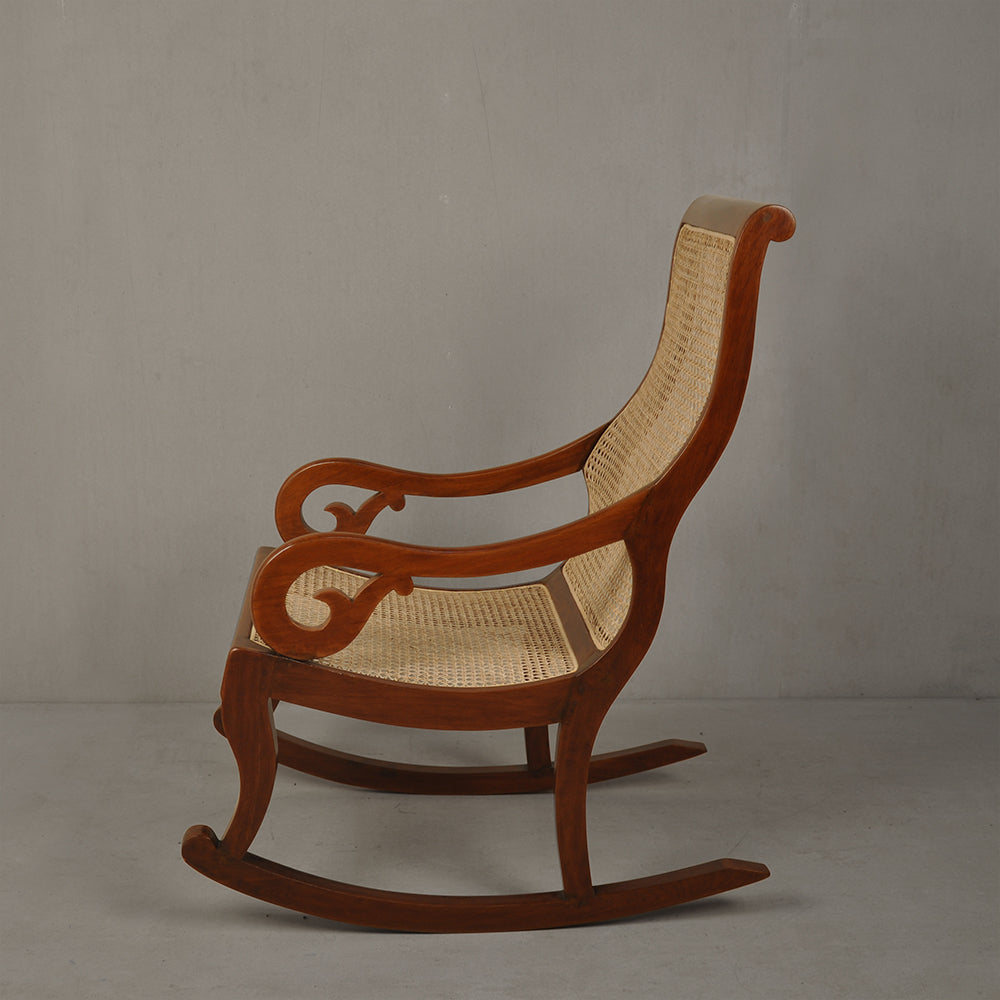 DESCRIPTION A small but extremely comfortable rocking chair is a great addition to a bedroom corner. It is also cozy enough to be used in the kids room. The back is visually stunning with a double curve and the low hand rests end in an elegant floral scroll. This chair is both comfortable when used with or without a foot stool.