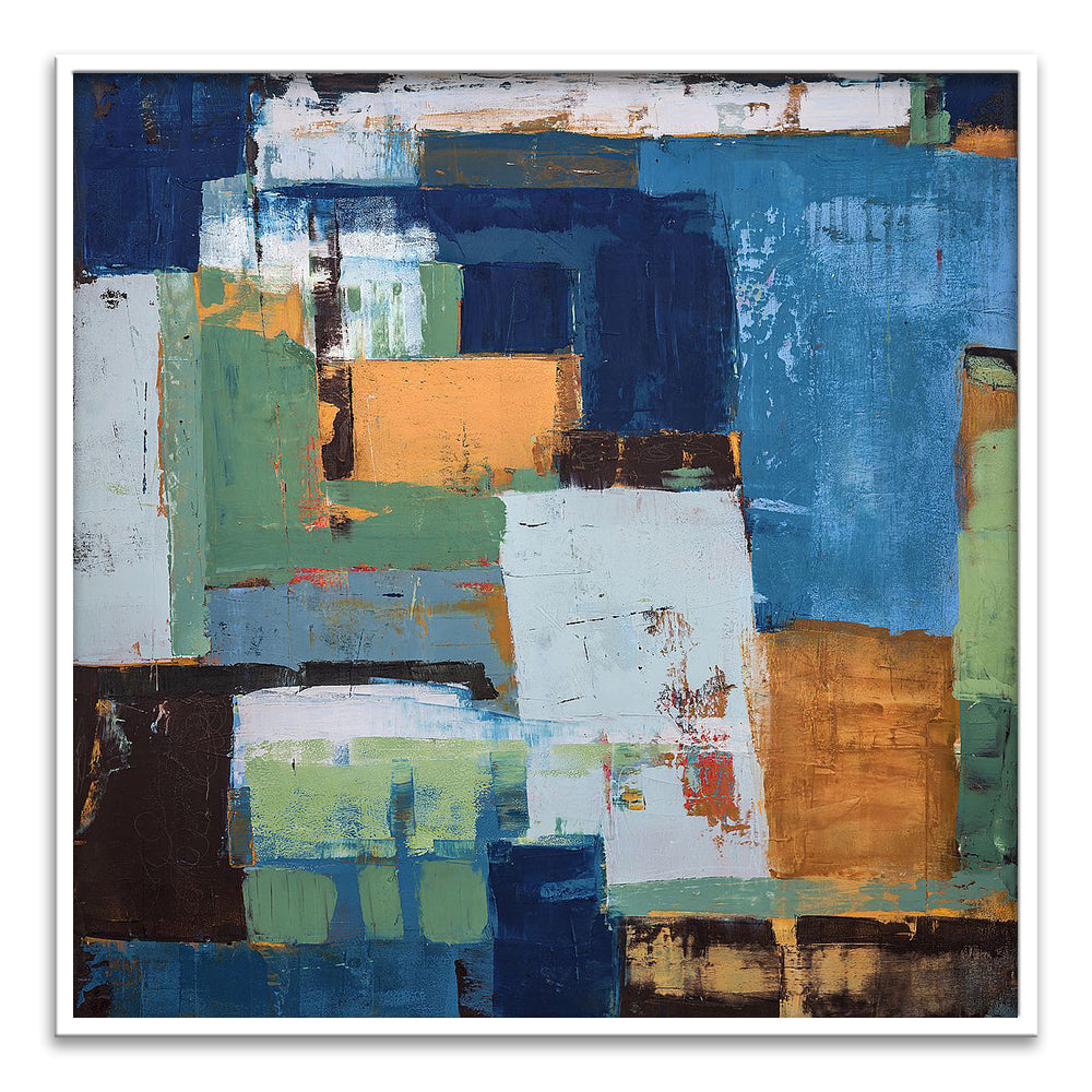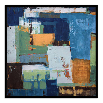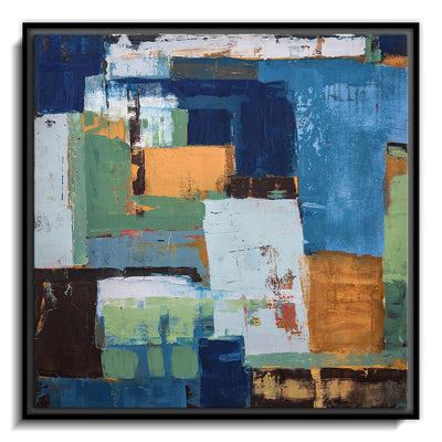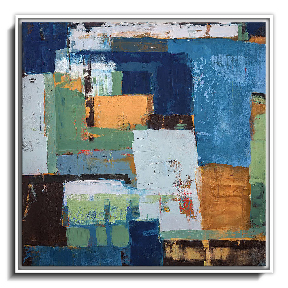 The canvas is wrapped and stretched similar to a gallery wrap and then mounted inside a wooden frame, leaving a small "gap", to create the illusion that the canvas is floating within the frame.