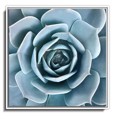 The canvas is wrapped and stretched similar to a gallery wrap and then mounted inside a wooden frame, leaving a small "gap", to create the illusion that the canvas is floating within the frame.