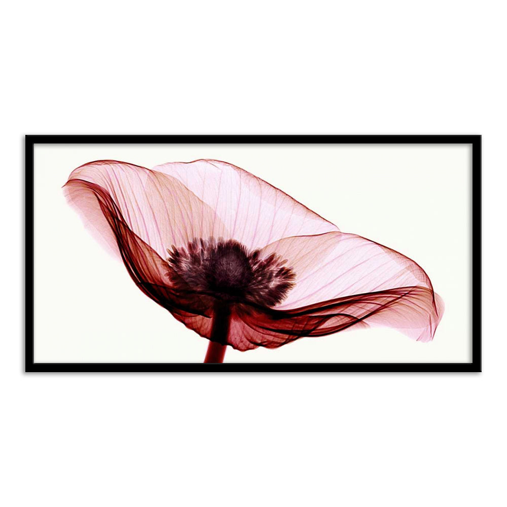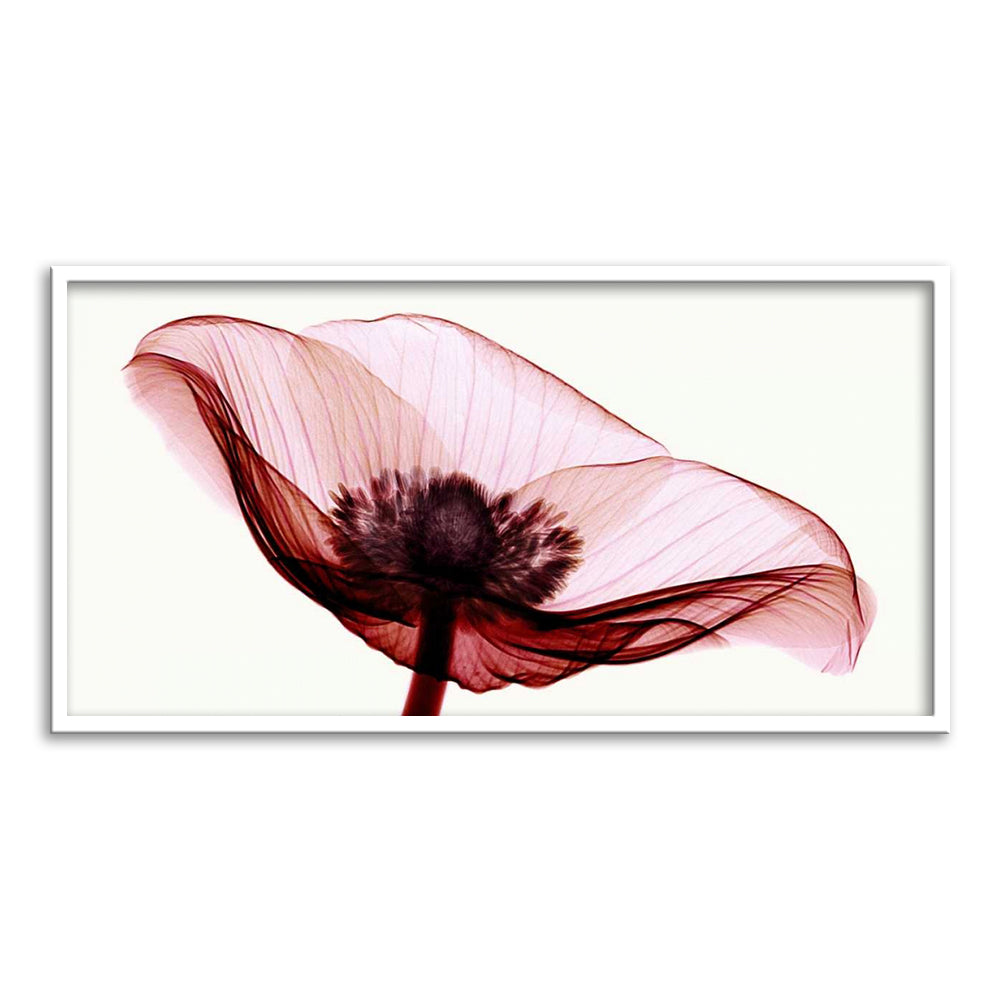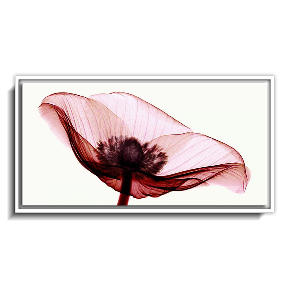 The canvas is wrapped and stretched similar to a gallery wrap and then mounted inside a wooden frame, leaving a small "gap", to create the illusion that the canvas is floating within the frame.