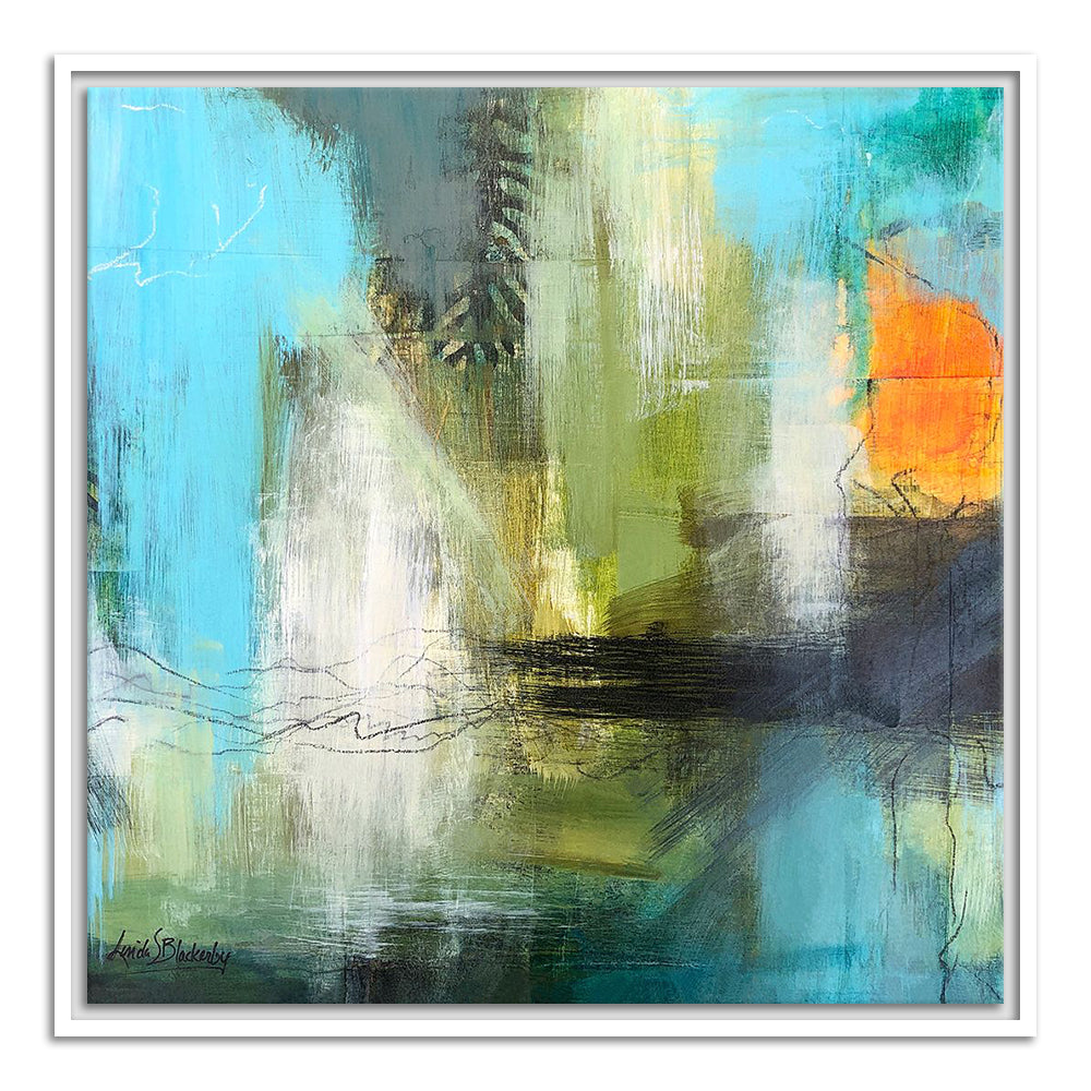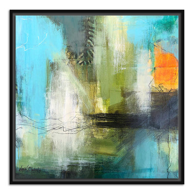 The canvas is wrapped and stretched similar to a gallery wrap and then mounted inside a wooden frame, leaving a small "gap", to create the illusion that the canvas is floating within the frame.