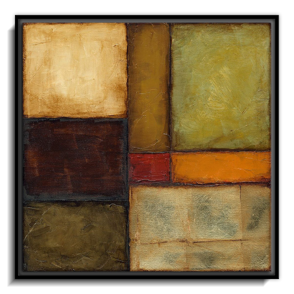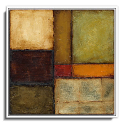 The canvas is wrapped and stretched similar to a gallery wrap and then mounted inside a wooden frame, leaving a small "gap", to create the illusion that the canvas is floating within the frame.