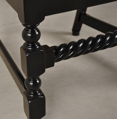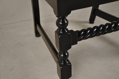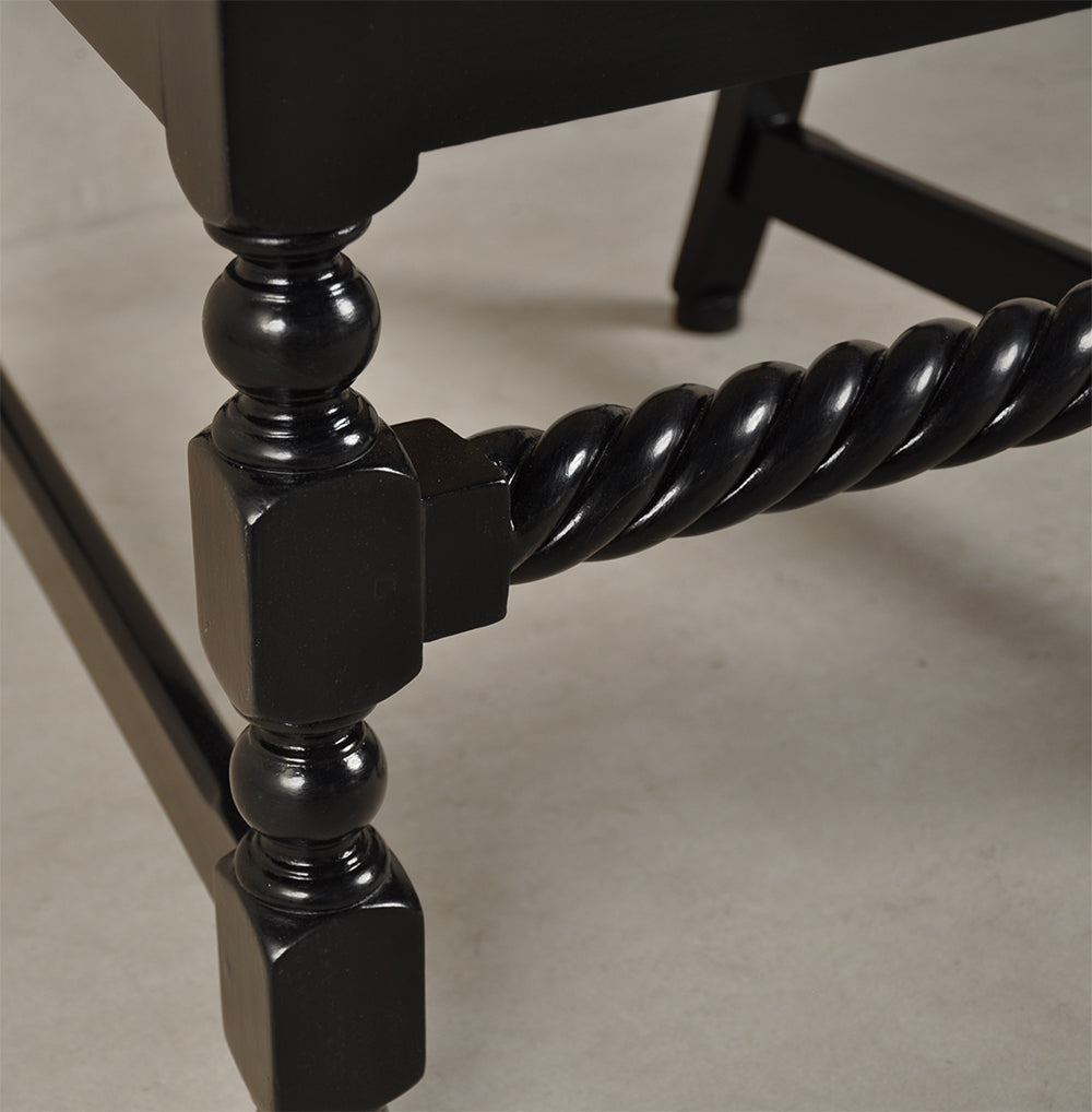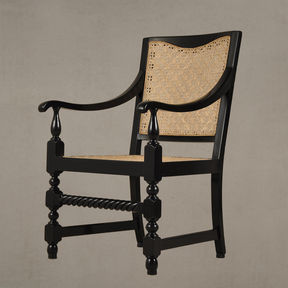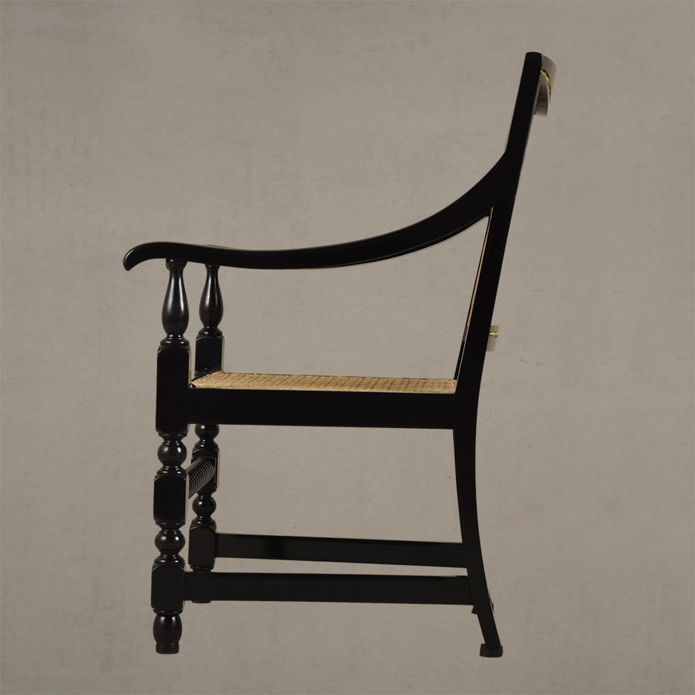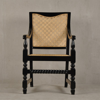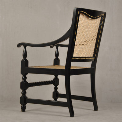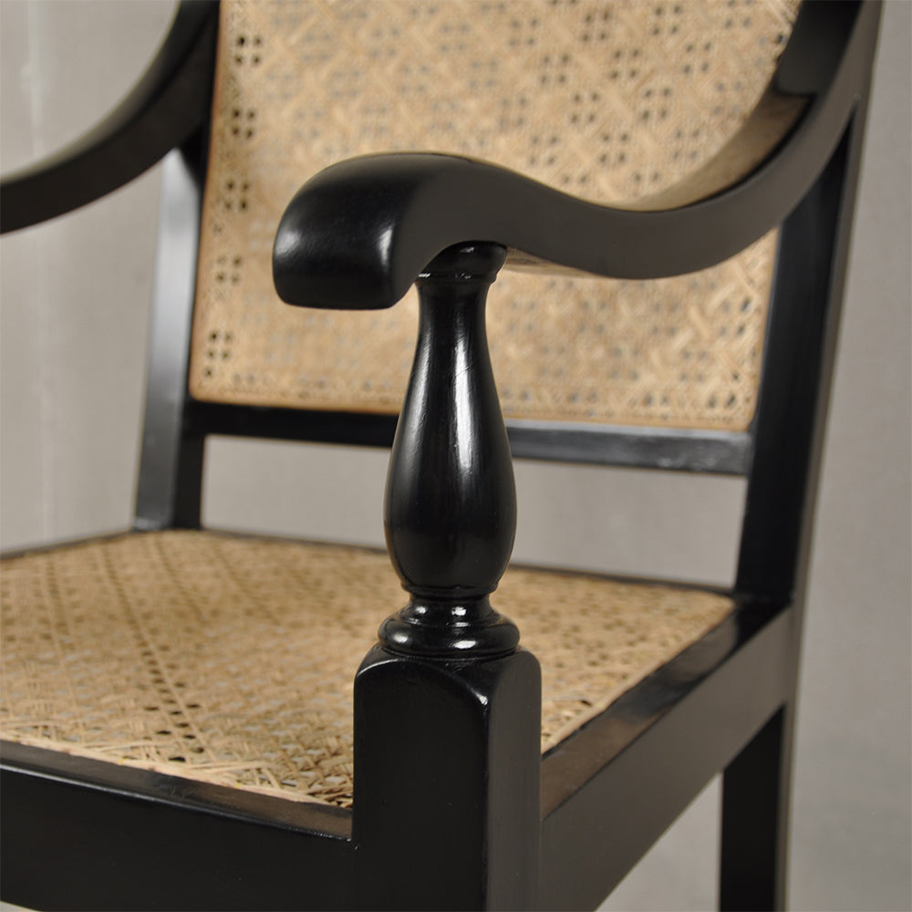 This piece is reproduced in teak wood and finished with black matte melamine polish. The caning weave is a 7-step pattern with intermittent diagonals using Assam cane.