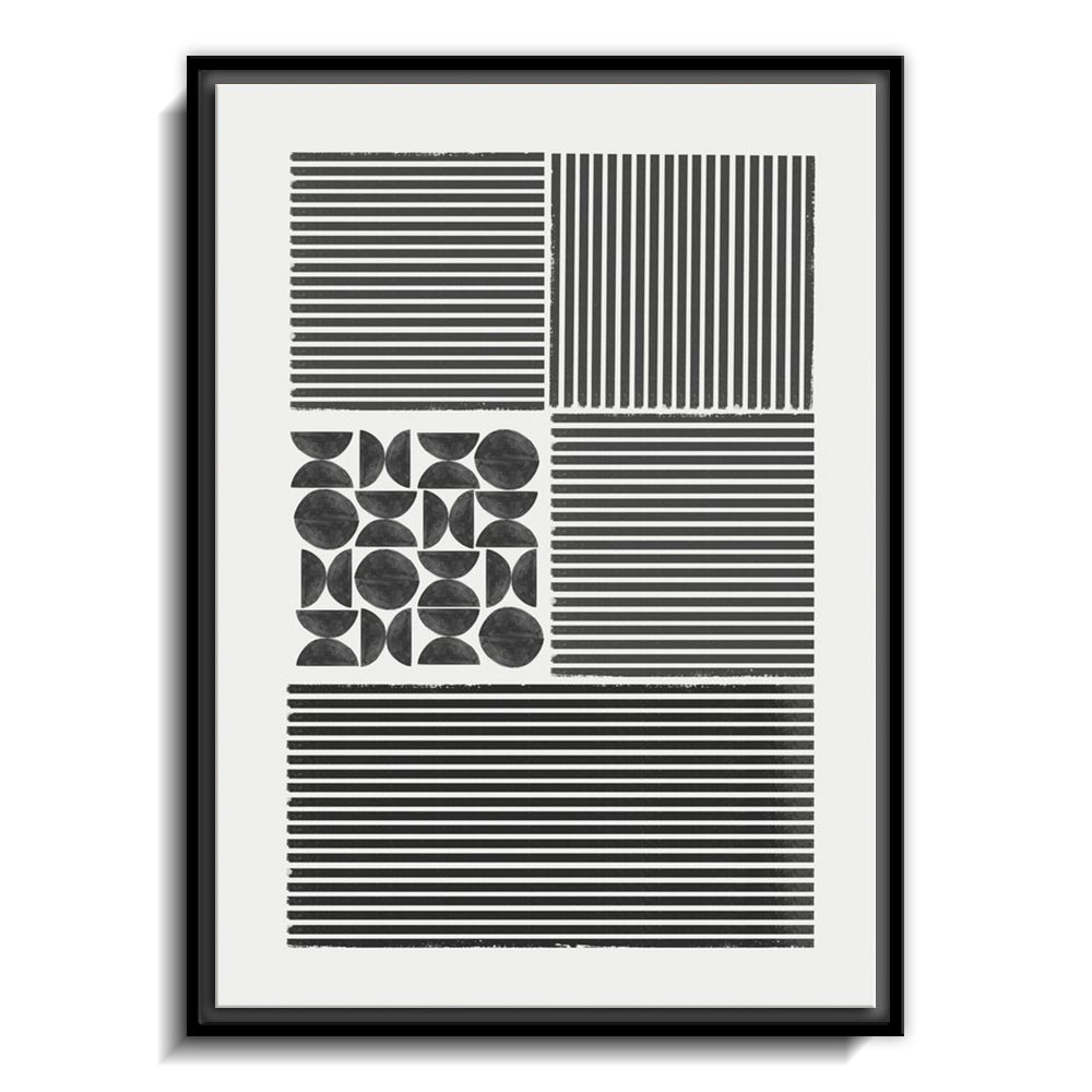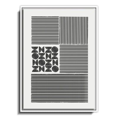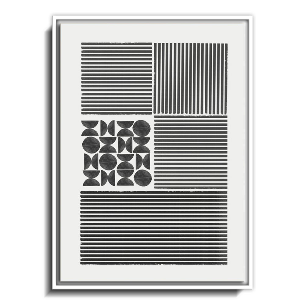 The canvas is wrapped and stretched similar to a gallery wrap and then mounted inside a wooden frame, leaving a small "gap", to create the illusion that the canvas is floating within the frame.