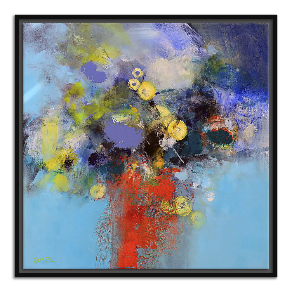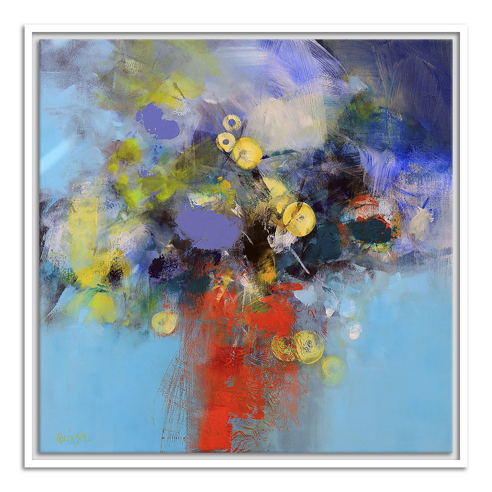 The canvas is wrapped and stretched similar to a gallery wrap and then mounted inside a wooden frame, leaving a small "gap", to create the illusion that the canvas is floating within the frame.