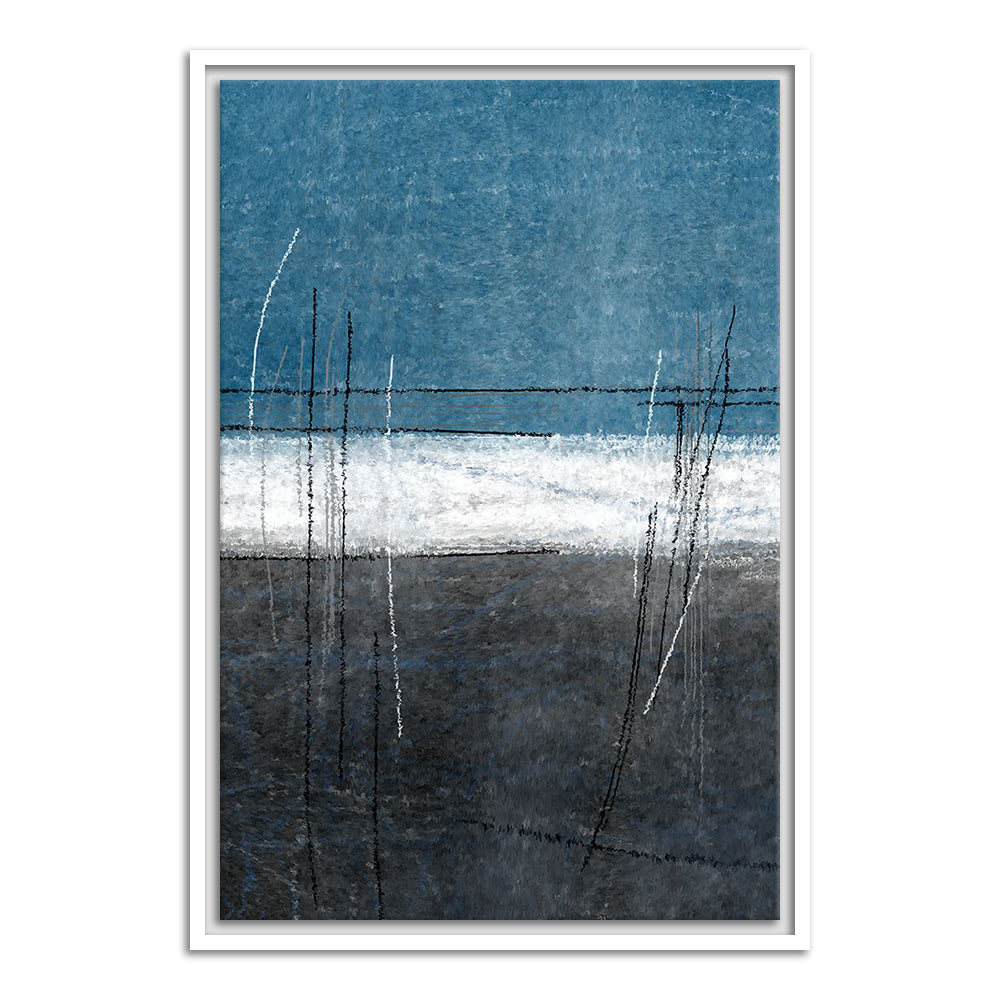 The canvas is wrapped and stretched similar to a gallery wrap and then mounted inside a wooden frame, leaving a small "gap", to create the illusion that the canvas is floating within the frame.