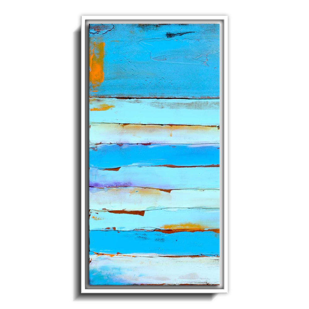 The canvas is wrapped and stretched similar to a gallery wrap and then mounted inside a wooden frame, leaving a small "gap", to create the illusion that the canvas is floating within the frame.