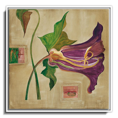 The canvas is wrapped and stretched similar to a gallery wrap and then mounted inside a wooden frame, leaving a small "gap", to create the illusion that the canvas is floating within the frame.