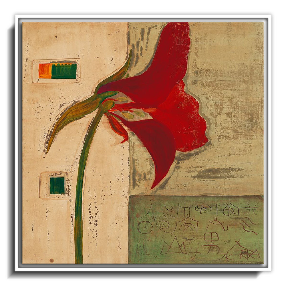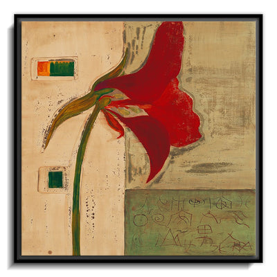 The canvas is wrapped and stretched similar to a gallery wrap and then mounted inside a wooden frame, leaving a small "gap", to create the illusion that the canvas is floating within the frame.