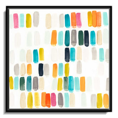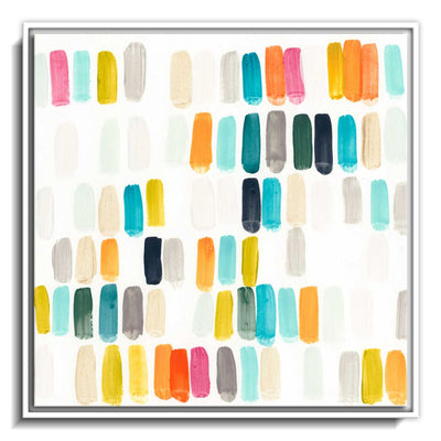 The canvas is wrapped and stretched similar to a gallery wrap and then mounted inside a wooden frame, leaving a small "gap", to create the illusion that the canvas is floating within the frame.