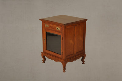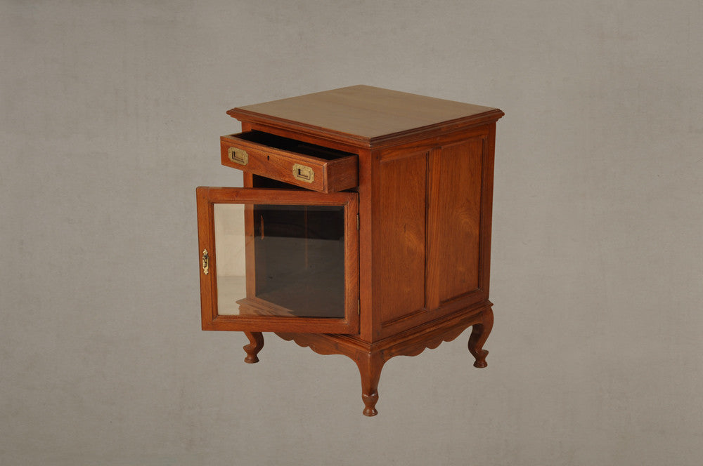 REPRODUCTION This piece is reproduced in salvaged teak wood and hand polished to perfection. The brass hardware is modeled on the original handles. The desk can be customized and finished in the preferred polish/ color. The leather top can be selected from the options available at the time of commission.