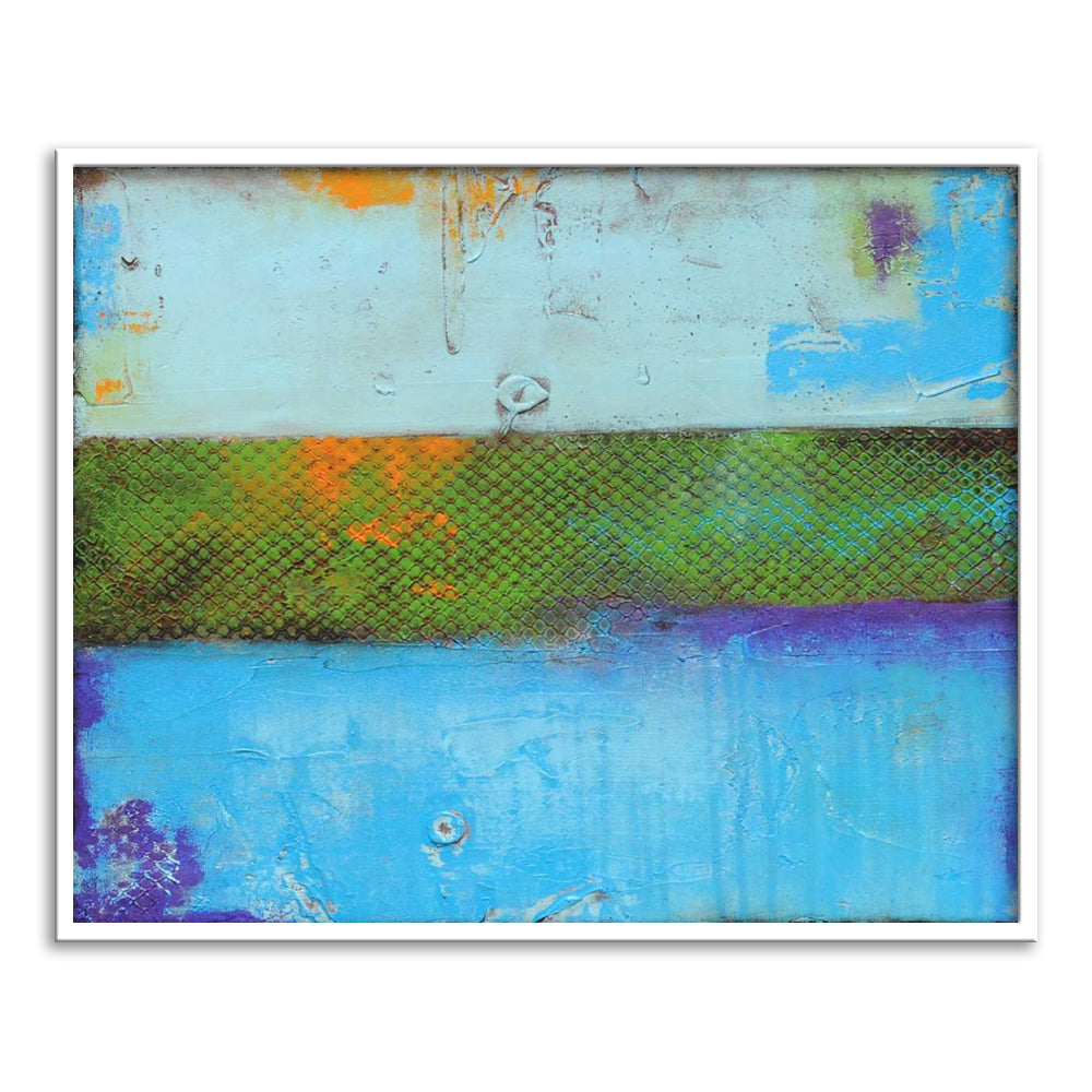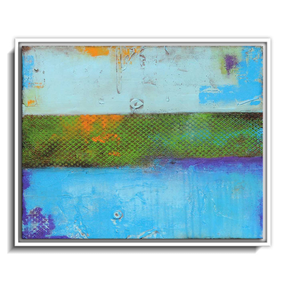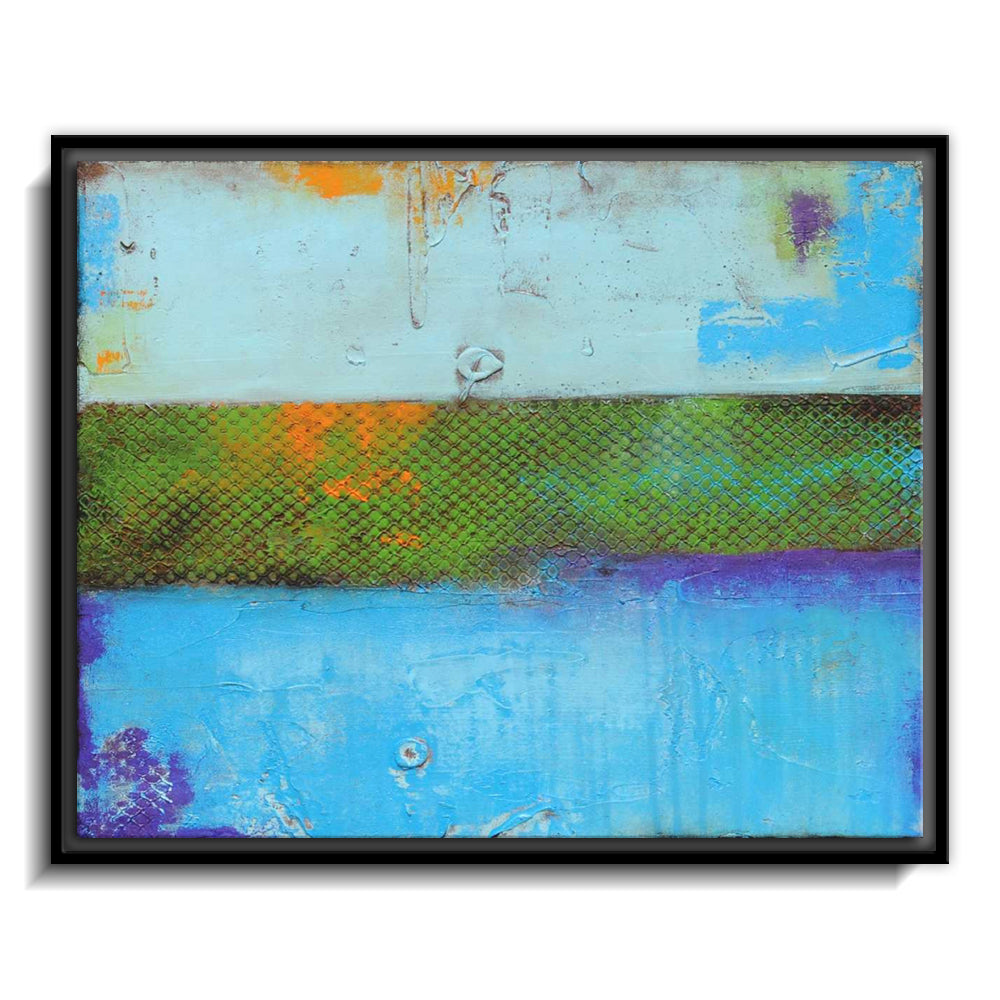 The canvas is wrapped and stretched similar to a gallery wrap and then mounted inside a wooden frame, leaving a small "gap", to create the illusion that the canvas is floating within the frame.
