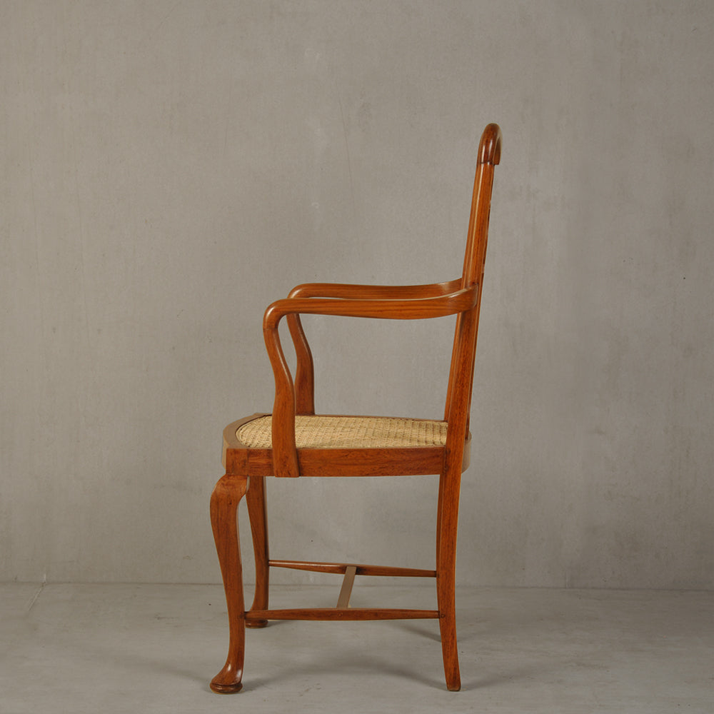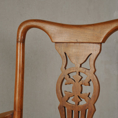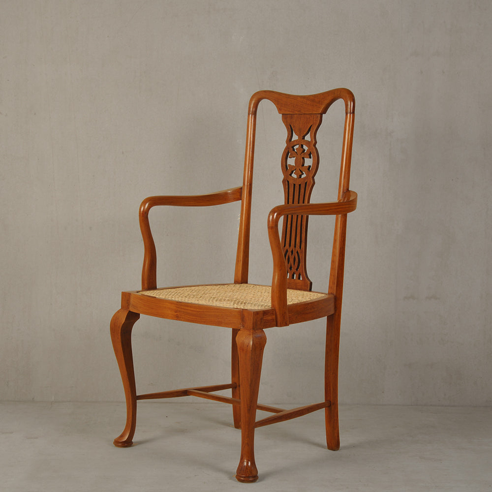 An elegant pair of teakwood Chippendale Dining Chairs, with a vase splat, a seat caned in a 3 x 3 grid pattern and the famously employed front cabriole legs. The Chippendale style falls within the Colonial period.