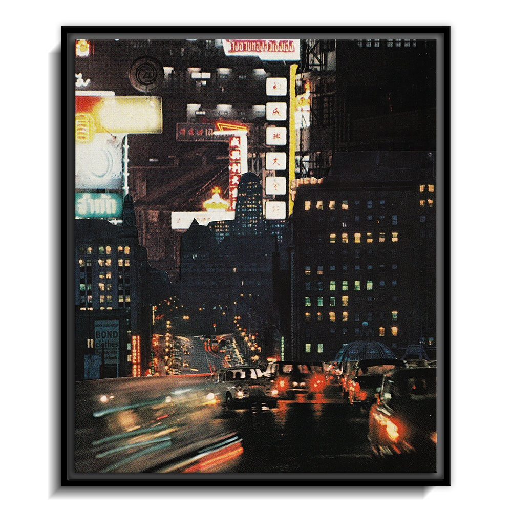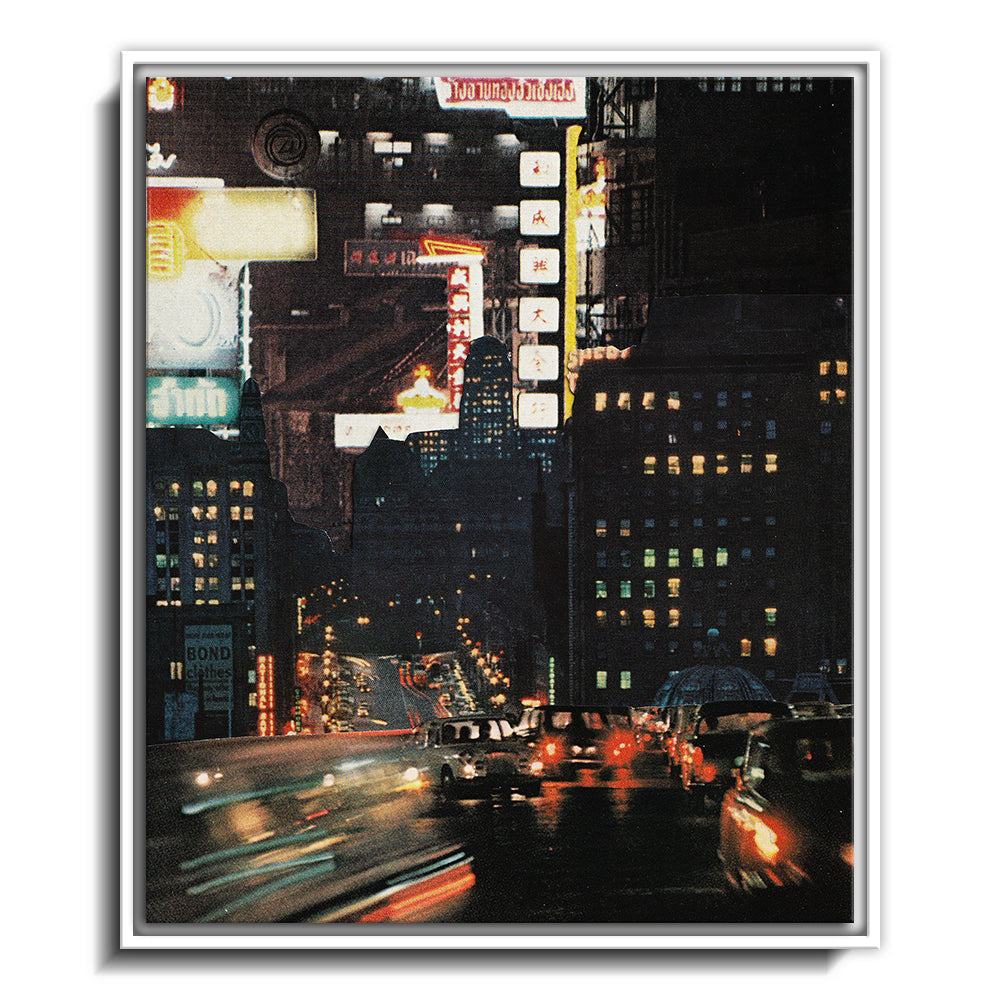 The canvas is wrapped and stretched similar to a gallery wrap and then mounted inside a wooden frame, leaving a small "gap", to create the illusion that the canvas is floating within the frame.