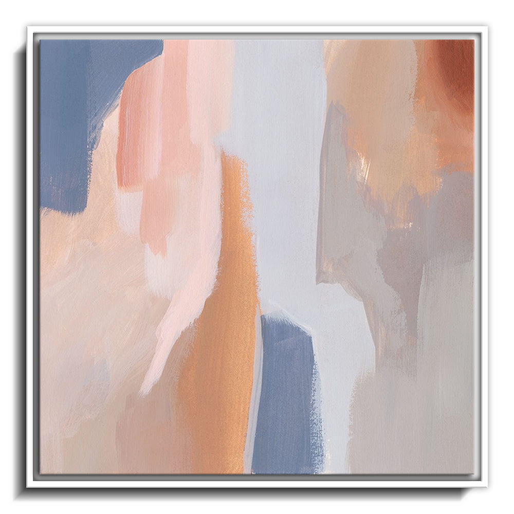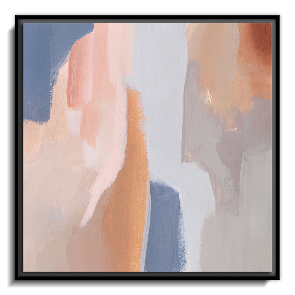 The canvas is wrapped and stretched similar to a gallery wrap and then mounted inside a wooden frame, leaving a small "gap", to create the illusion that the canvas is floating within the frame.