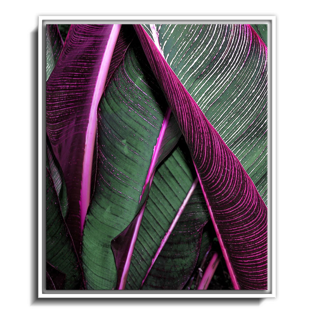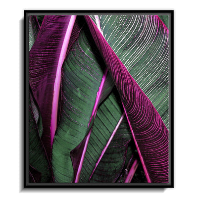The canvas is wrapped and stretched similar to a gallery wrap and then mounted inside a wooden frame, leaving a small "gap", to create the illusion that the canvas is floating within the frame.