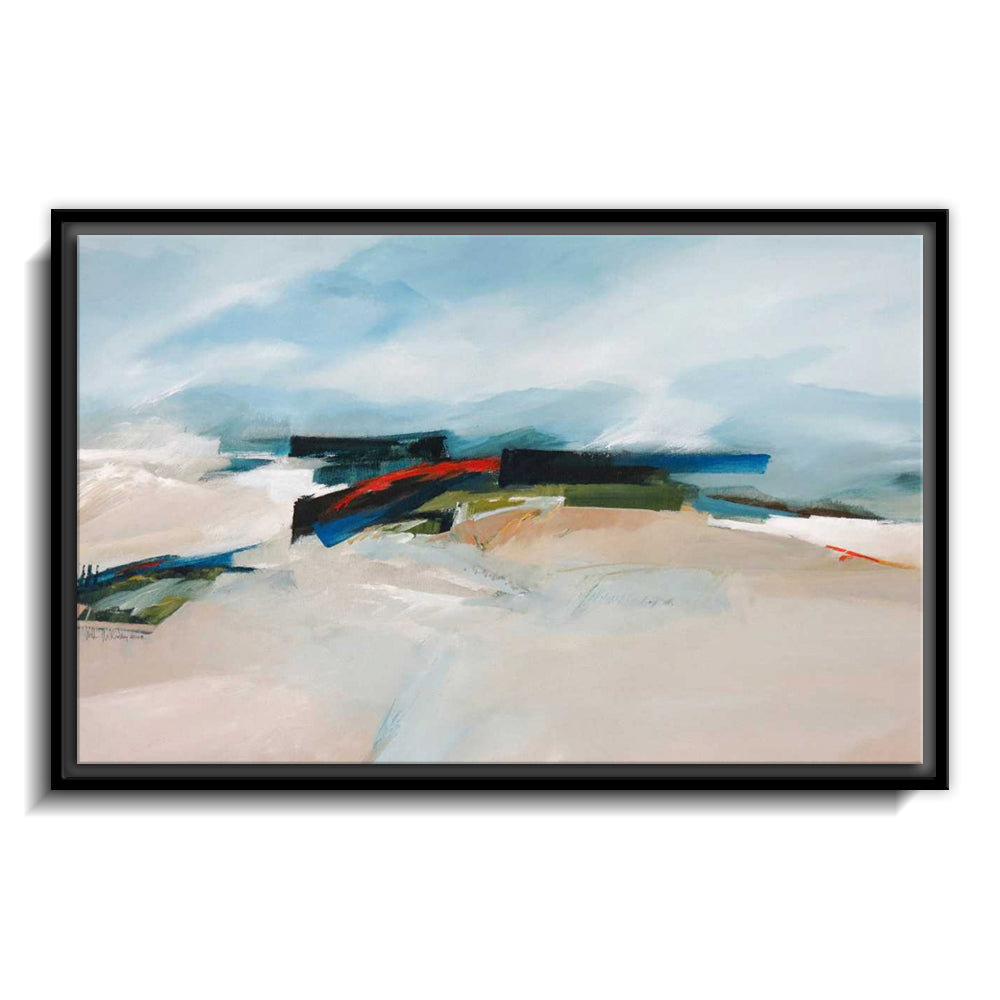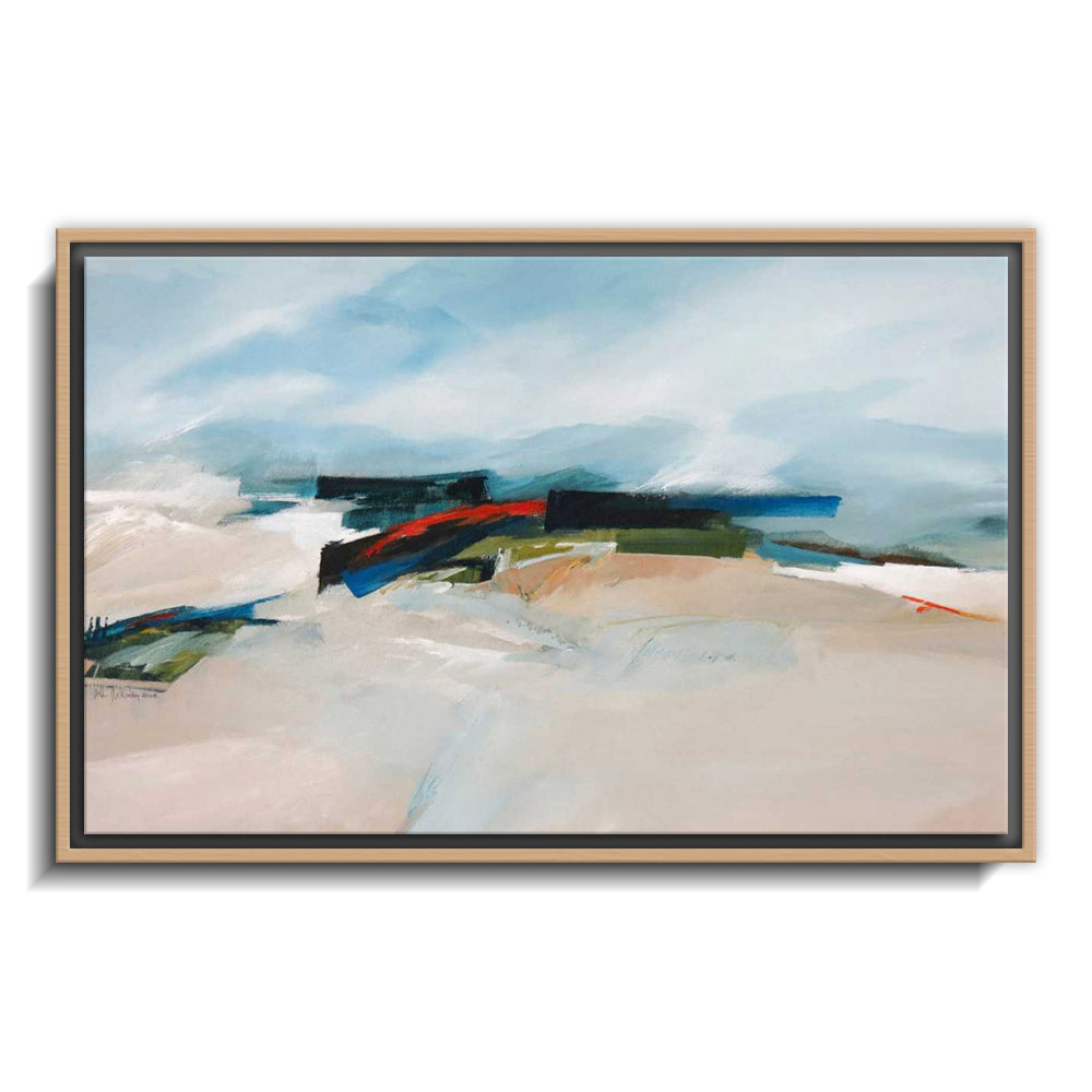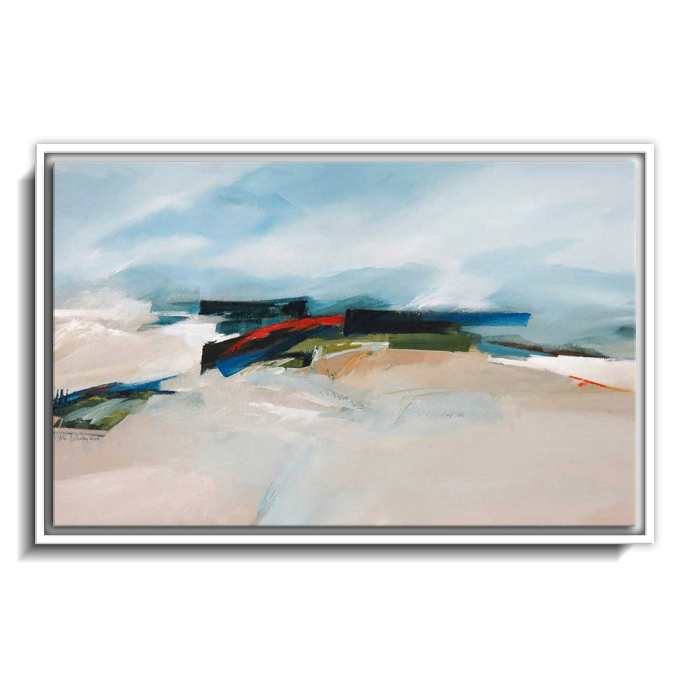 The canvas is wrapped and stretched similar to a gallery wrap and then mounted inside a wooden frame, leaving a small "gap", to create the illusion that the canvas is floating within the frame.