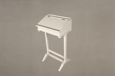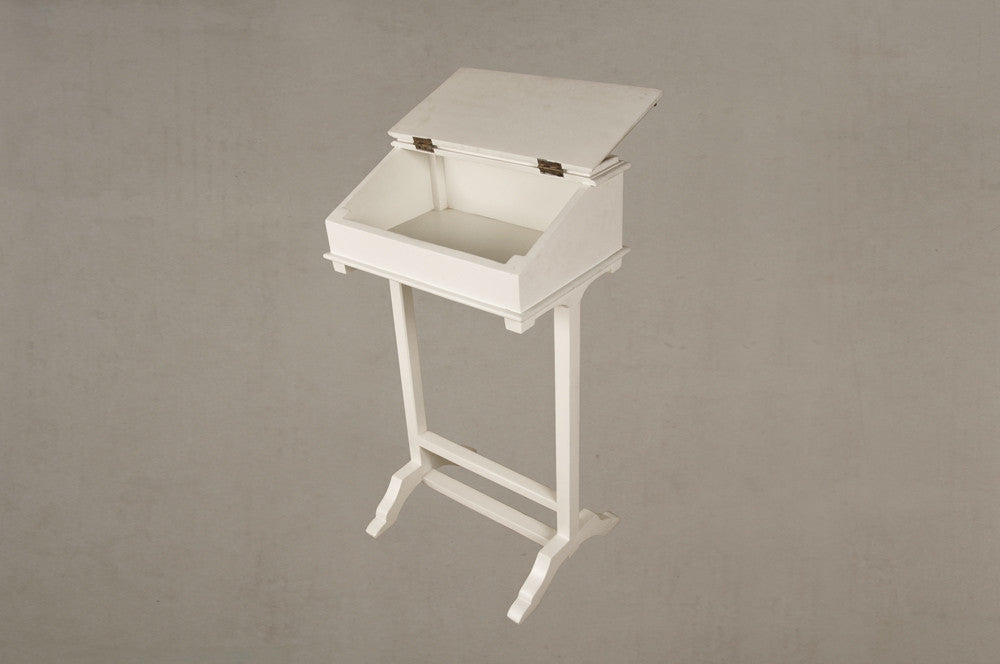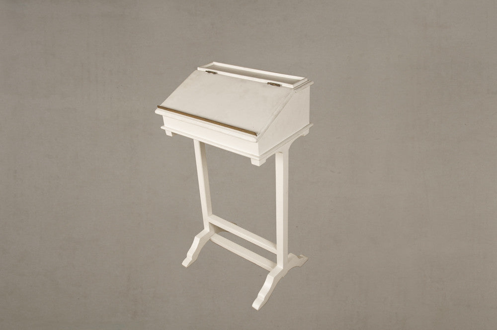 DESCRIPTION A smart writing/ reading table with storage, this sleek table is fitted with a brass insert to hold up books or magazines. It is an ideal size storage that can be fitted into a lobby/ study or even a kitchen to hold cookery books.