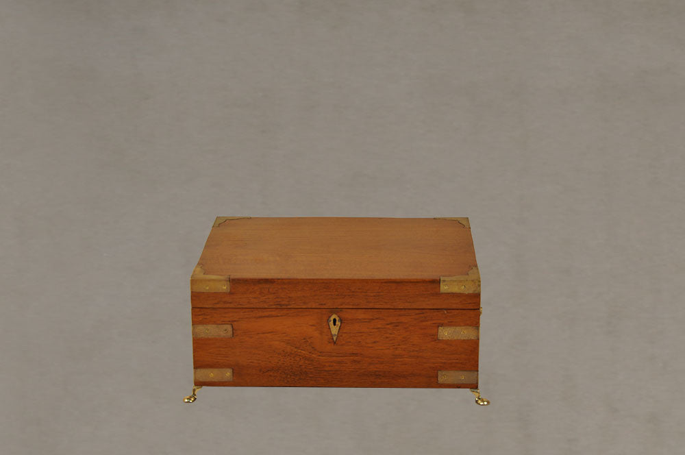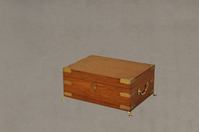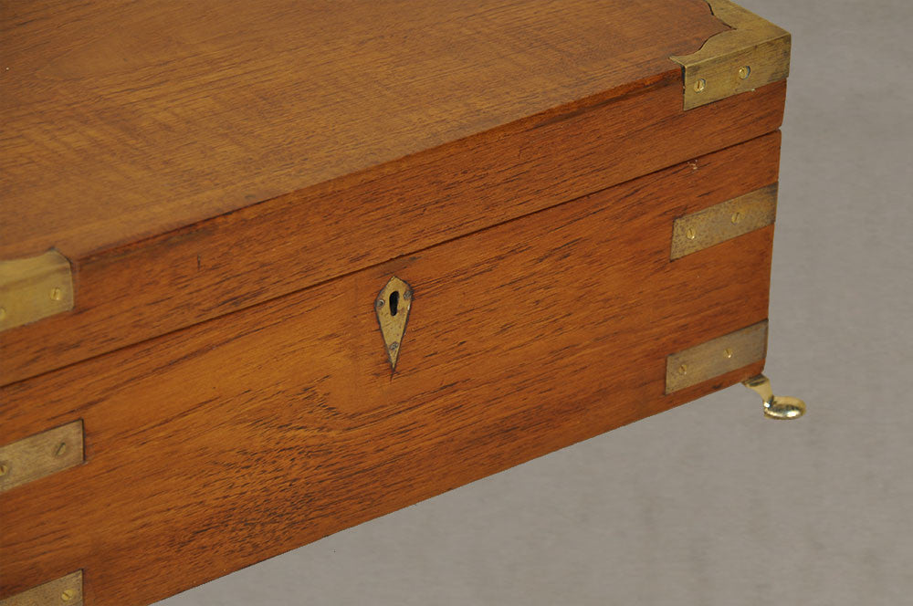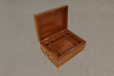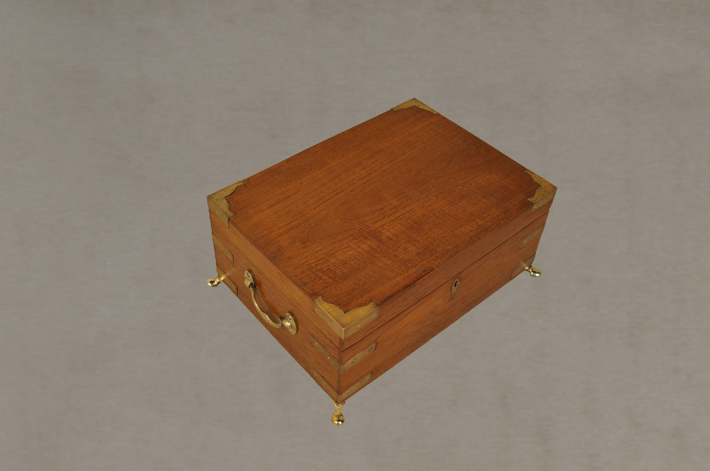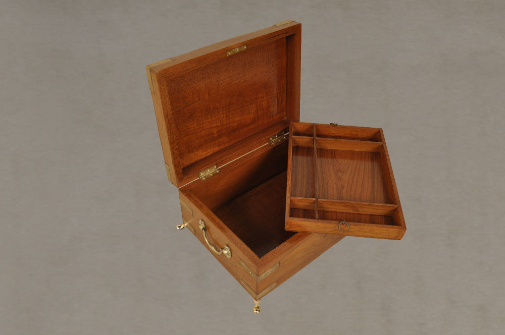 DESCRIPTION A teak wood chest with elegant brass inlay including drop brass handles. It has a top tray which is easily removable and is perfect to pass around for after dinner mints or chocolates. Tiny brass feet have been added to give the chest a good height.