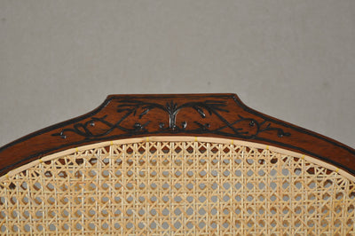 DESCRIPTION This chair has an elliptical back and sides that turn elegantly towards the outside, making it very comfortable to rest your hands. The chair is extremely comfortable with a back, seat and side caned panels, a telling sign of high quality furniture of the period. The legs are tapered, ending in spade feet.