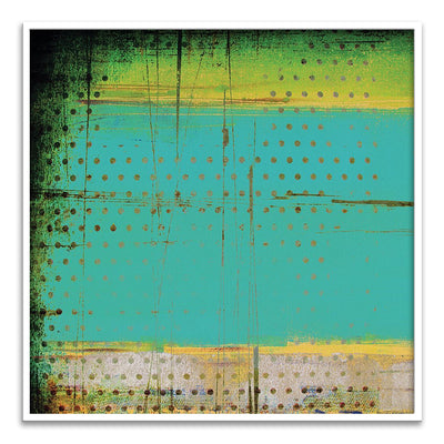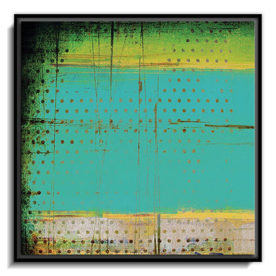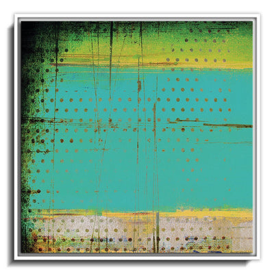 The canvas is wrapped and stretched similar to a gallery wrap and then mounted inside a wooden frame, leaving a small "gap", to create the illusion that the canvas is floating within the frame.