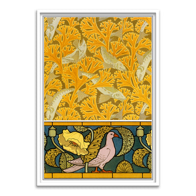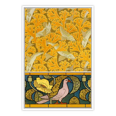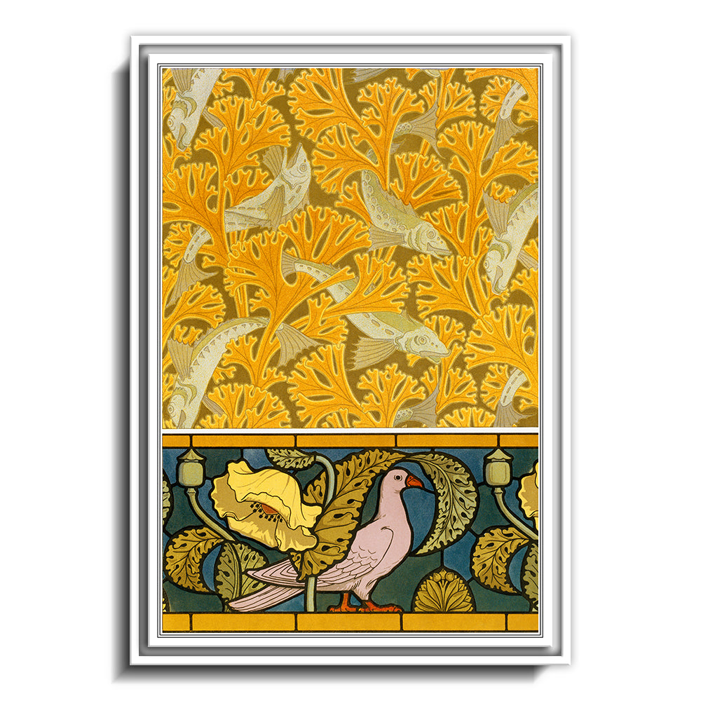 The canvas is wrapped and stretched similar to a gallery wrap and then mounted inside a wooden frame, leaving a small "gap", to create the illusion that the canvas is floating within the frame.
