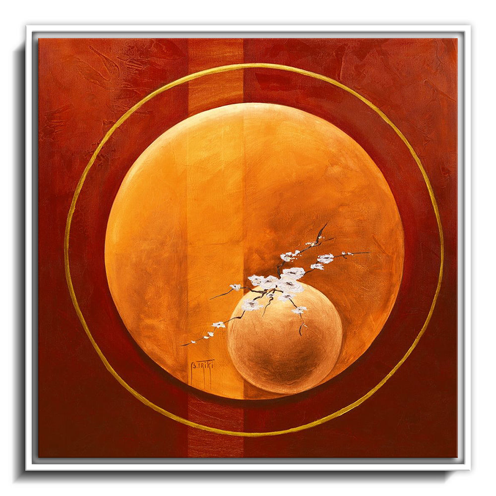 The canvas is wrapped and stretched similar to a gallery wrap and then mounted inside a wooden frame, leaving a small "gap", to create the illusion that the canvas is floating within the frame.