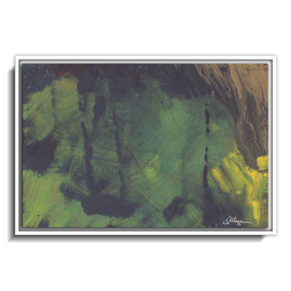 The canvas is wrapped and stretched similar to a gallery wrap and then mounted inside a wooden frame, leaving a small "gap", to create the illusion that the canvas is floating within the frame.