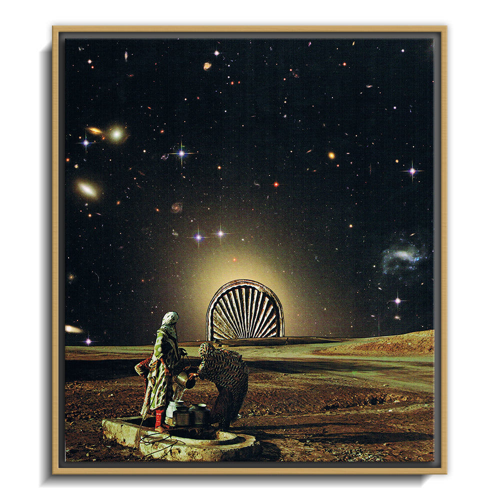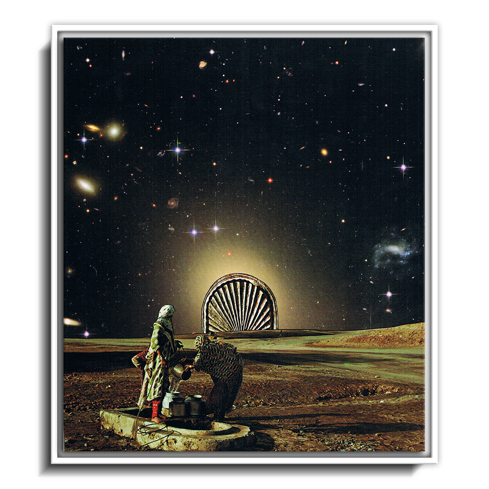 The canvas is wrapped and stretched similar to a gallery wrap and then mounted inside a wooden frame, leaving a small "gap", to create the illusion that the canvas is floating within the frame.