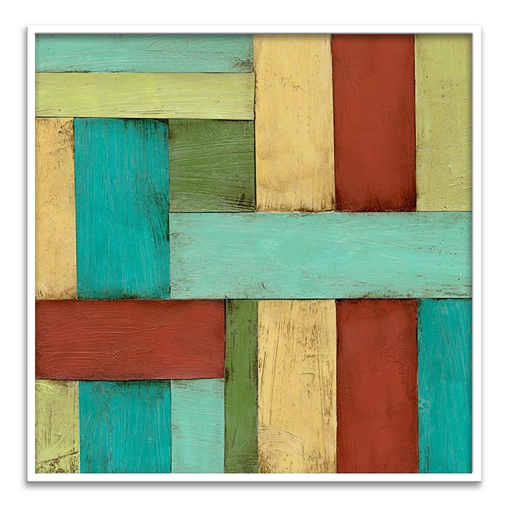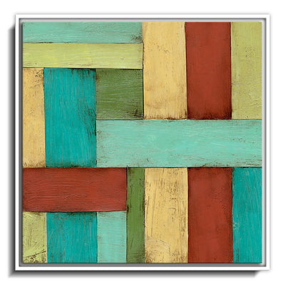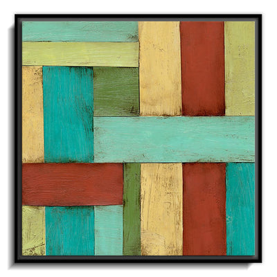 The canvas is wrapped and stretched similar to a gallery wrap and then mounted inside a wooden frame, leaving a small "gap", to create the illusion that the canvas is floating within the frame.