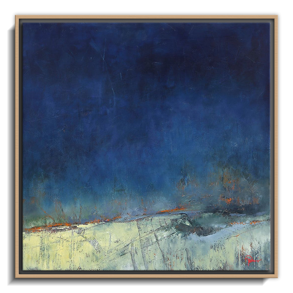 The canvas is wrapped and stretched similar to a gallery wrap and then mounted inside a wooden frame, leaving a small "gap", to create the illusion that the canvas is floating within the frame.