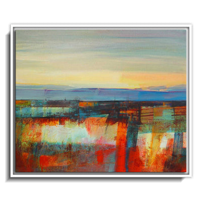 The canvas is wrapped and stretched similar to a gallery wrap and then mounted inside a wooden frame, leaving a small "gap", to create the illusion that the canvas is floating within the frame.
