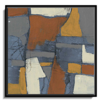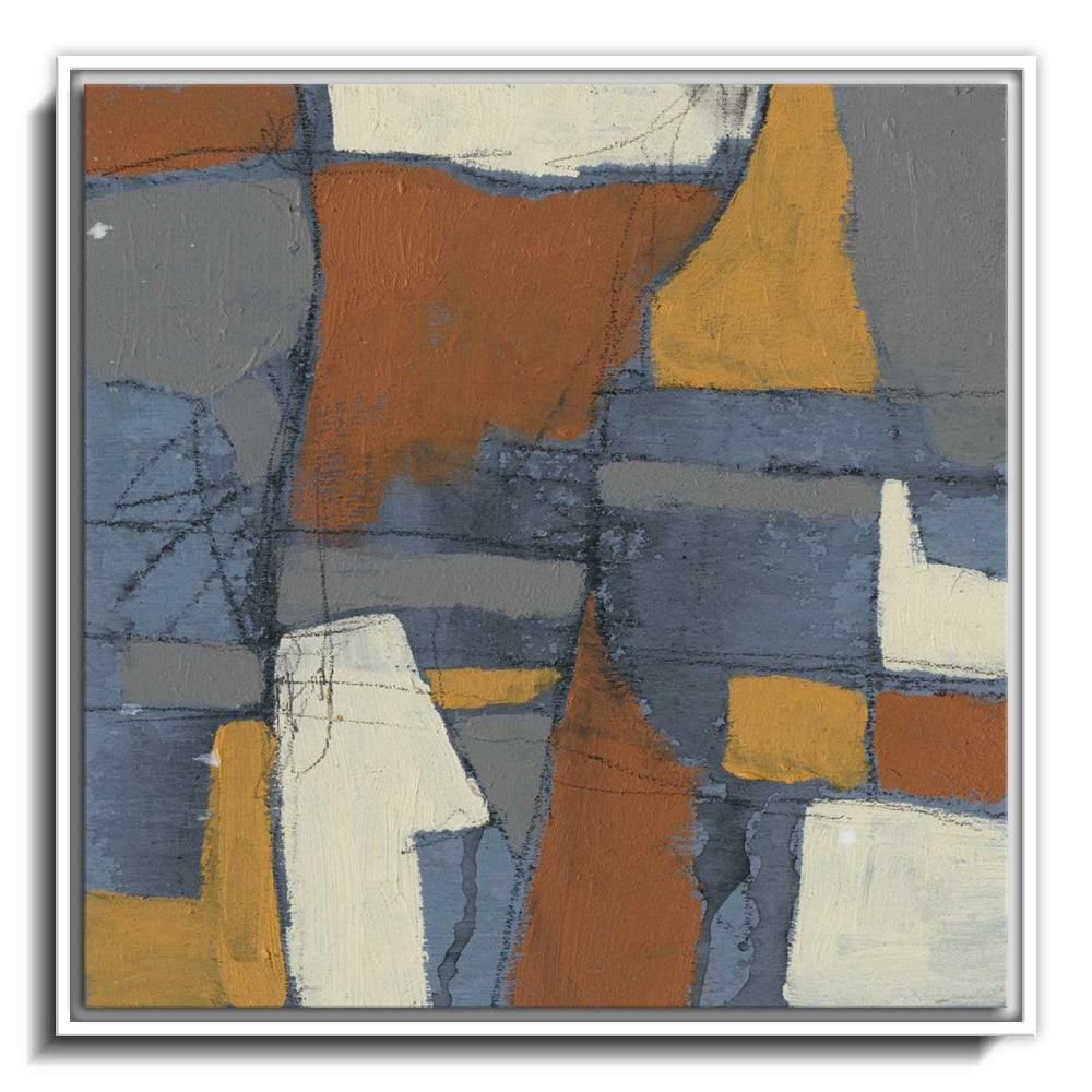 The canvas is wrapped and stretched similar to a gallery wrap and then mounted inside a wooden frame, leaving a small "gap", to create the illusion that the canvas is floating within the frame.