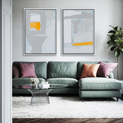 The canvas is wrapped and stretched similar to a gallery wrap and then mounted inside a wooden frame, leaving a small "gap", to create the illusion that the canvas is floating within the frame.