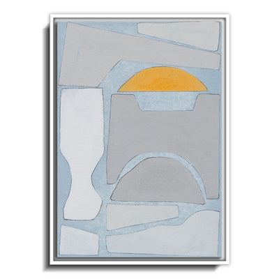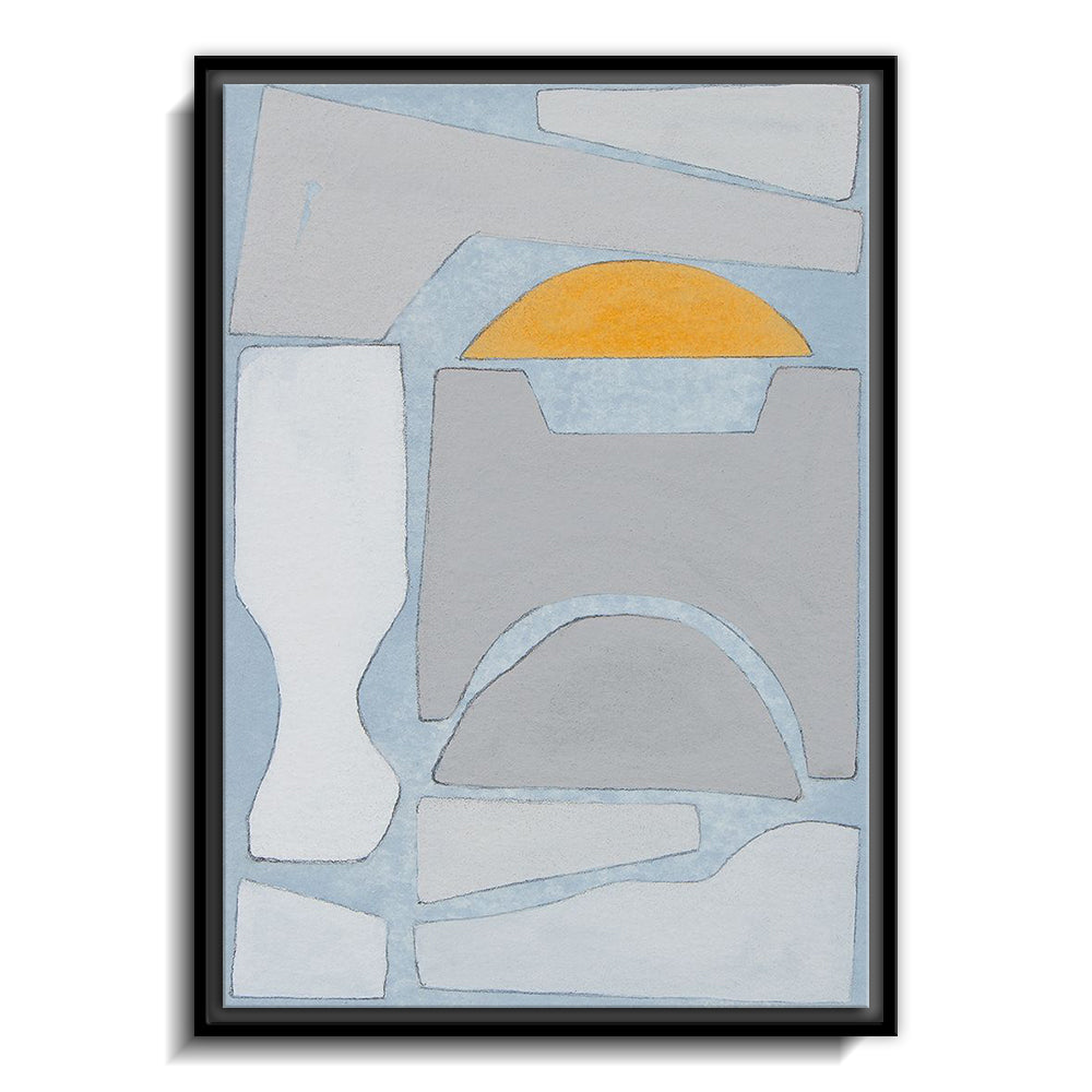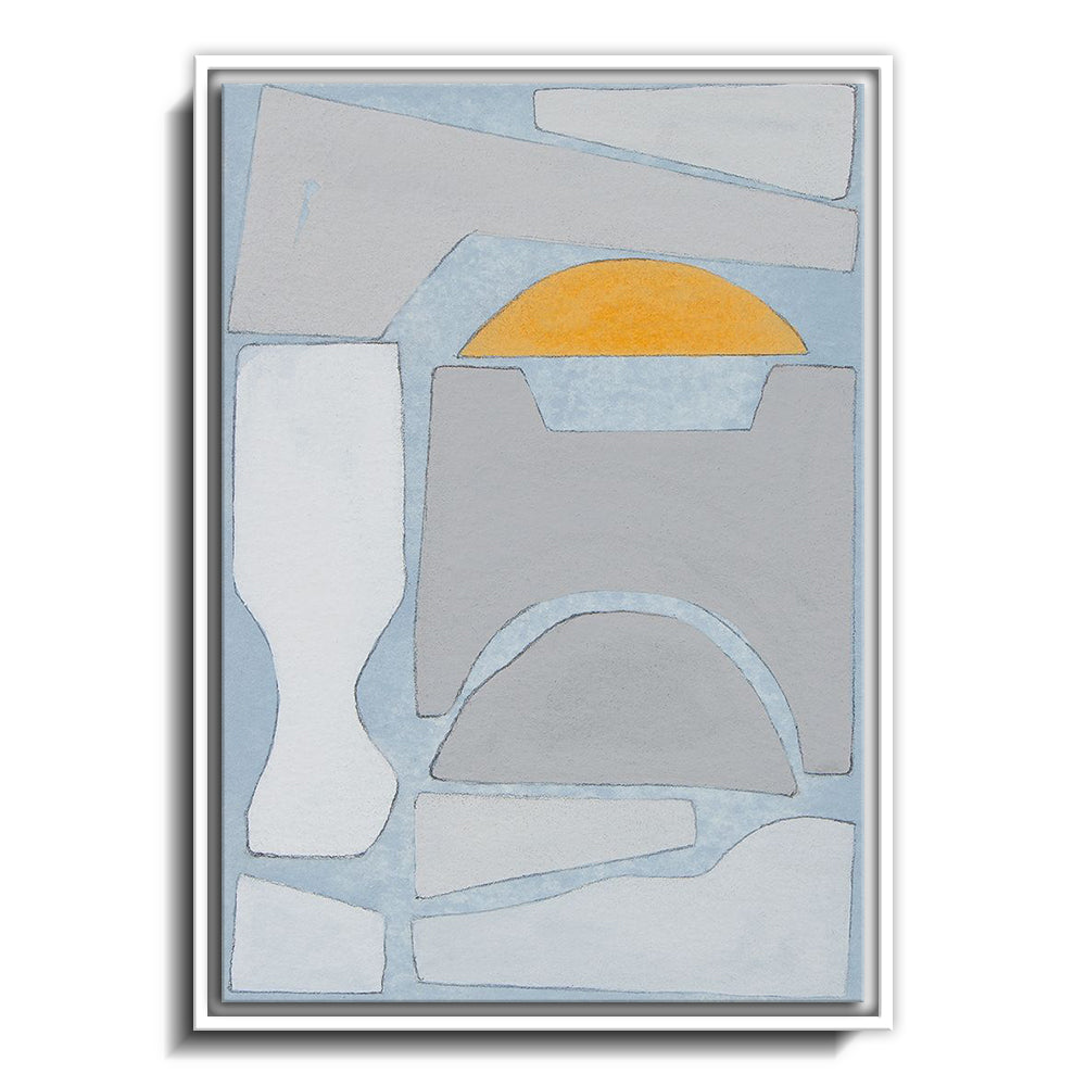 The canvas is wrapped and stretched similar to a gallery wrap and then mounted inside a wooden frame, leaving a small "gap", to create the illusion that the canvas is floating within the frame.