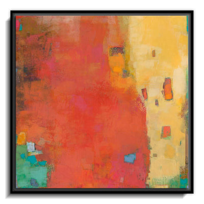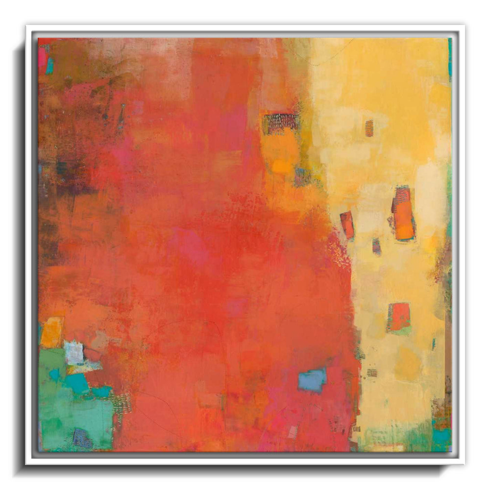 The canvas is wrapped and stretched similar to a gallery wrap and then mounted inside a wooden frame, leaving a small "gap", to create the illusion that the canvas is floating within the frame.