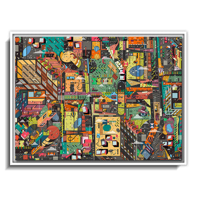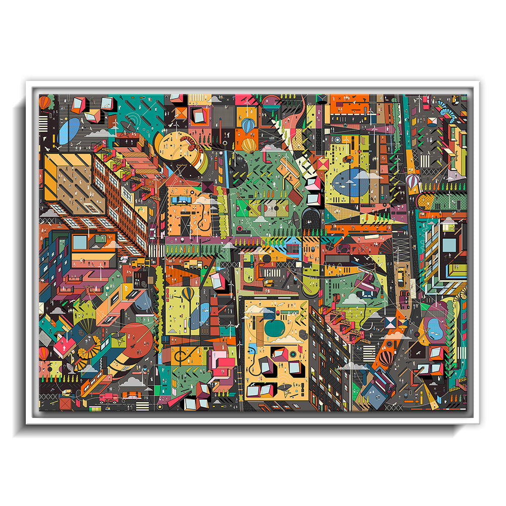 The canvas is wrapped and stretched similar to a gallery wrap and then mounted inside a wooden frame, leaving a small "gap", to create the illusion that the canvas is floating within the frame.