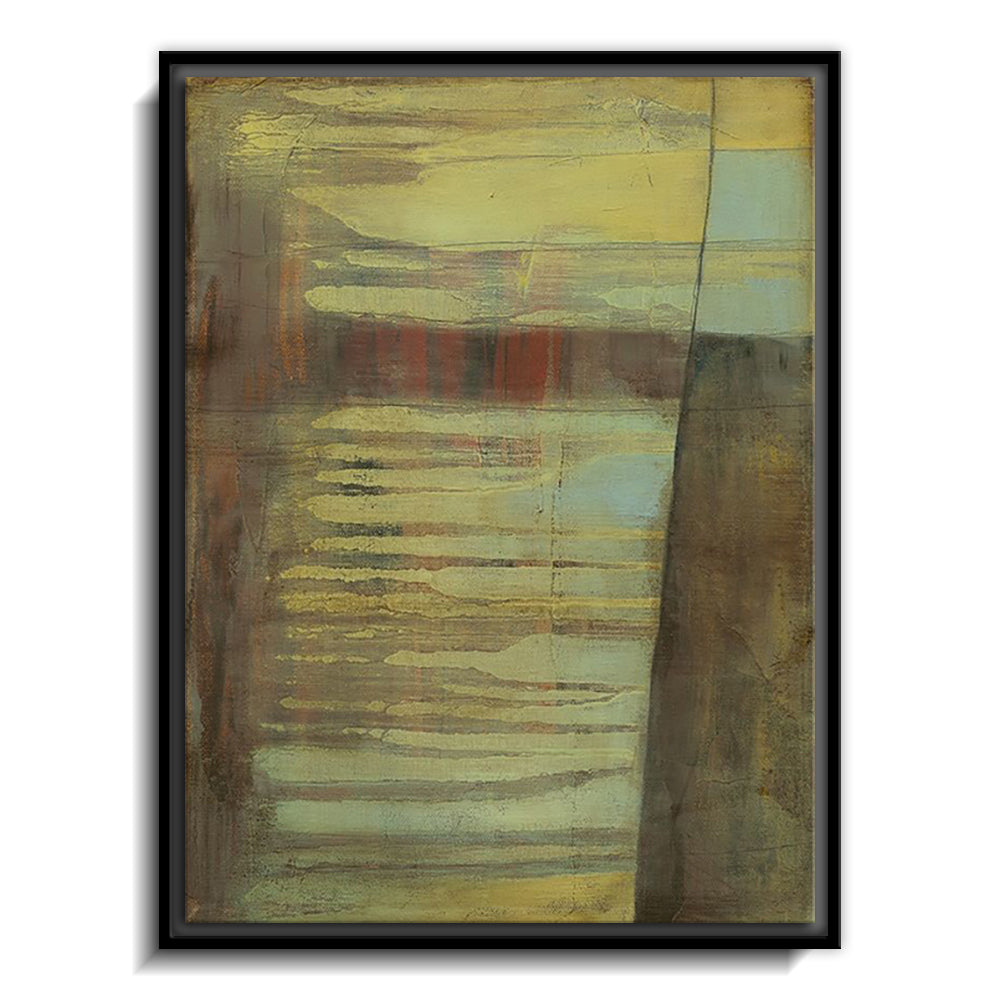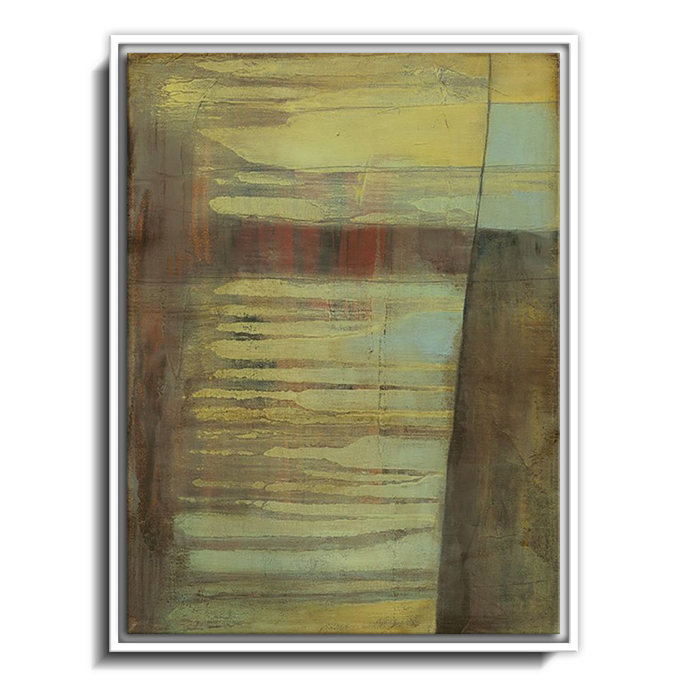 The canvas is wrapped and stretched similar to a gallery wrap and then mounted inside a wooden frame, leaving a small "gap", to create the illusion that the canvas is floating within the frame.