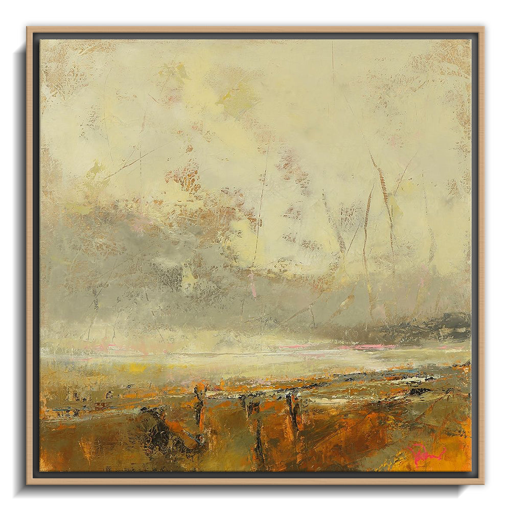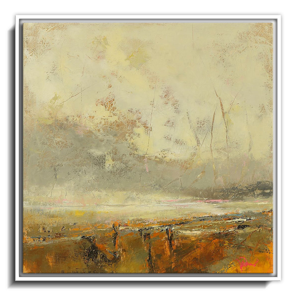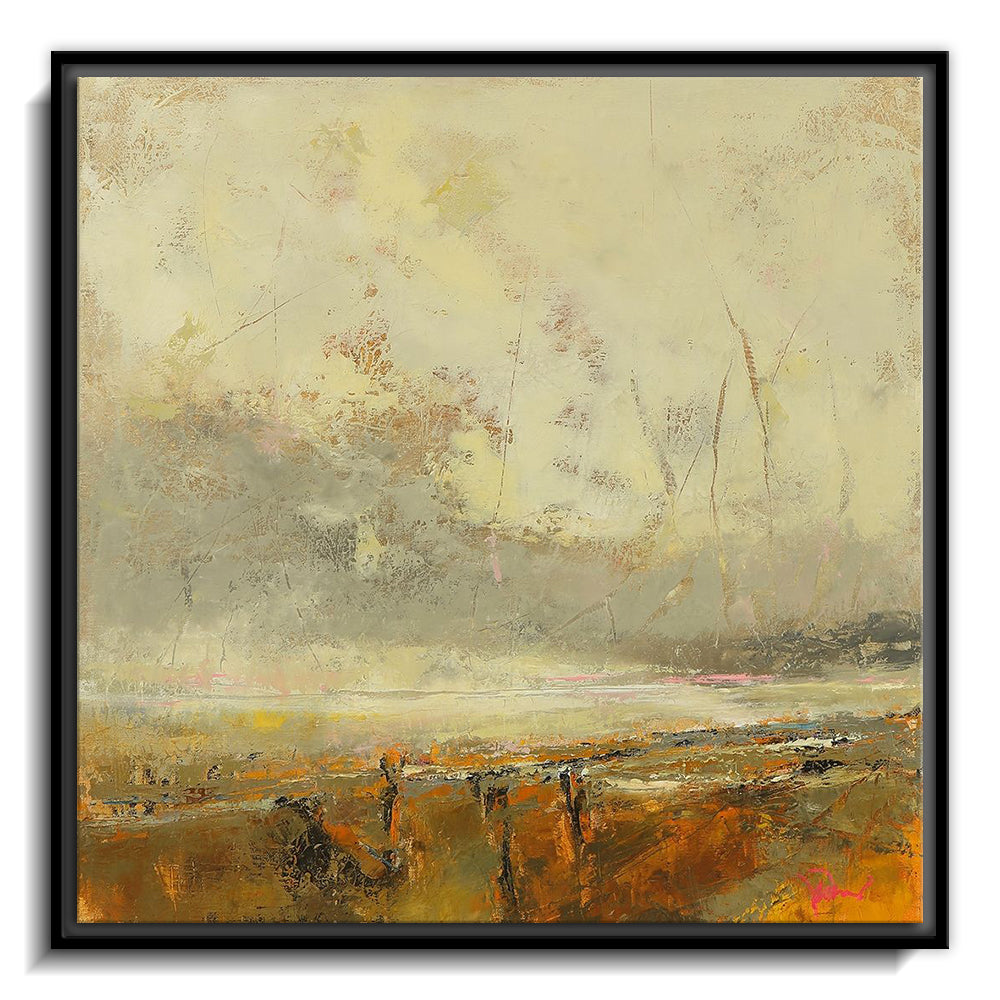 The canvas is wrapped and stretched similar to a gallery wrap and then mounted inside a wooden frame, leaving a small "gap", to create the illusion that the canvas is floating within the frame.