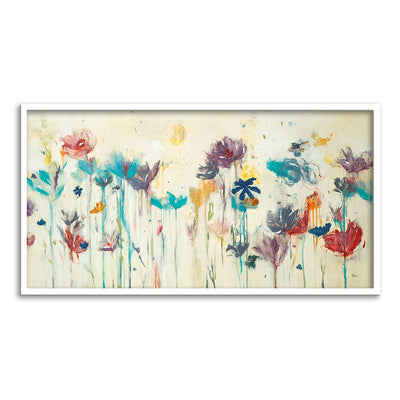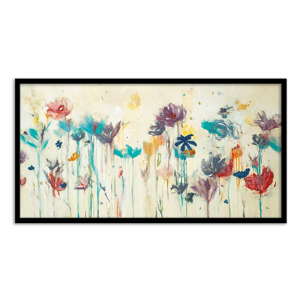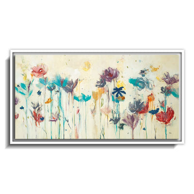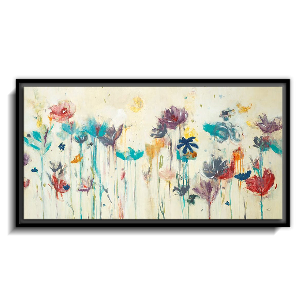 The canvas is wrapped and stretched similar to a gallery wrap and then mounted inside a wooden frame, leaving a small "gap", to create the illusion that the canvas is floating within the frame.