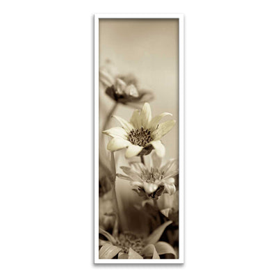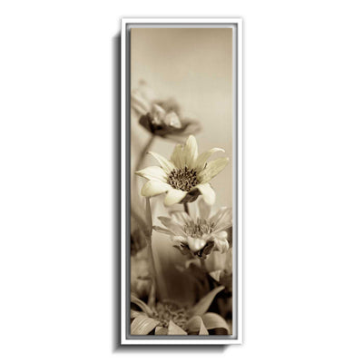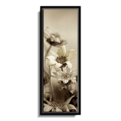 The canvas is wrapped and stretched similar to a gallery wrap and then mounted inside a wooden frame, leaving a small "gap", to create the illusion that the canvas is floating within the frame.