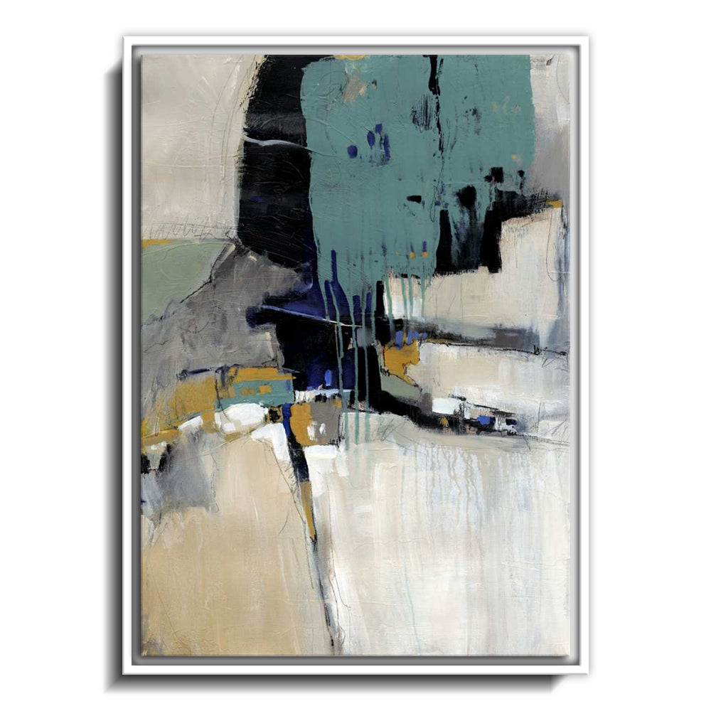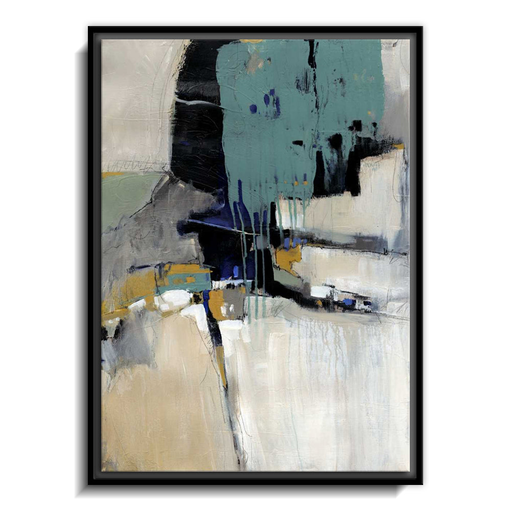 The canvas is wrapped and stretched similar to a gallery wrap and then mounted inside a wooden frame, leaving a small "gap", to create the illusion that the canvas is floating within the frame.